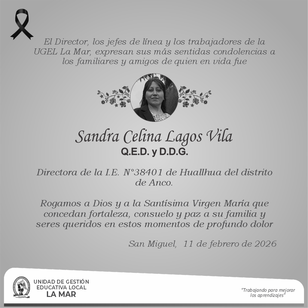 La UGEL La Mar, expresa su más profundo pesar por el sensible fallecimiento de quien en vida fue la 𝗣𝗿𝗼𝗳. 𝗦𝗮𝗻𝗱𝗿𝗮 𝗖𝗲𝗹𝗶𝗻𝗮 𝗟𝗮𝗴𝗼𝘀 𝗩𝗶𝗹𝗮.
