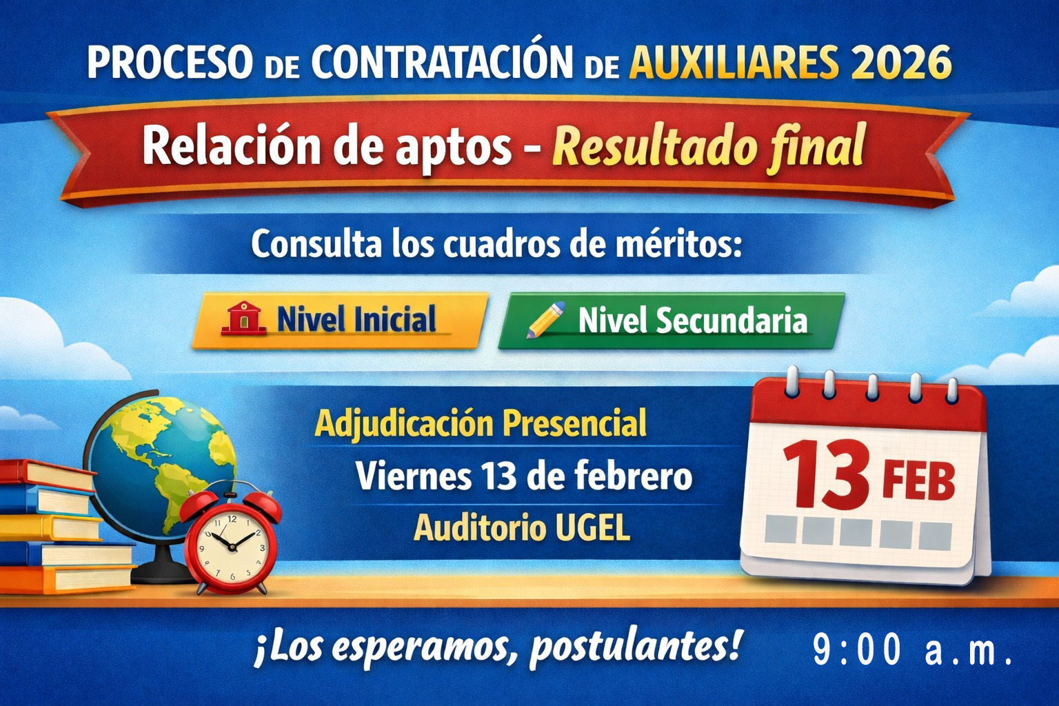 Nota: La adjudicación presencial según orden de mérito será el viernes 13 de febrero - 9:00 a.m., en el auditorio de la UGEL.