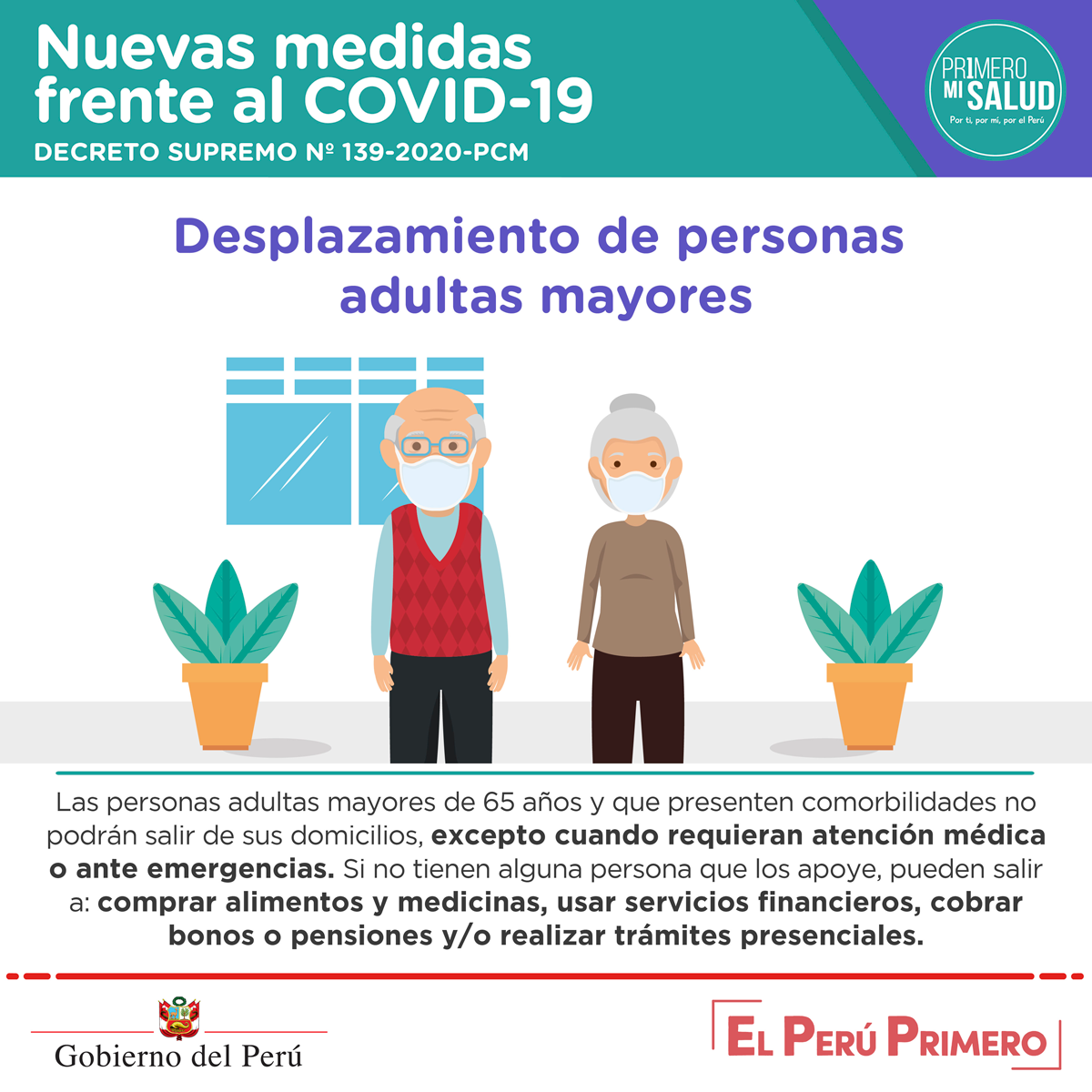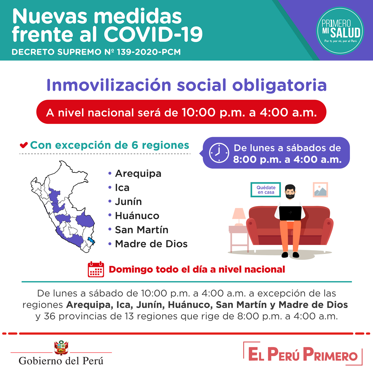 Escrito en 13 Agosto 2020. Visto: 3320 Estas son las nuevas medidas del Decreto Supremo N.° 139-2020-PCM dispuestas por el Gobierno para combatir el COVID-19. #PrimeroMiSalud < Anterior Siguiente >