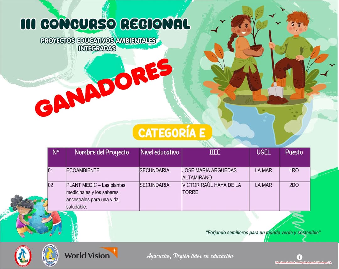 Nuestro reconocimiento y felicitaciones a los directores, plana docente, personal administrativo, estudiantes y padres de familia de las instituciones educativas: "Víctor Raúl Haya de la Torre" de Luis Carranza, "José María Arguedas Altamirano" de Santa Rosa, y 424 "Urpichas de Oro" de Tambo - UGEL La Mar, por los logros importantes y significativos, obtenidos en el Concurso Regional de Proyectos Educativos Ambientales Integradas.