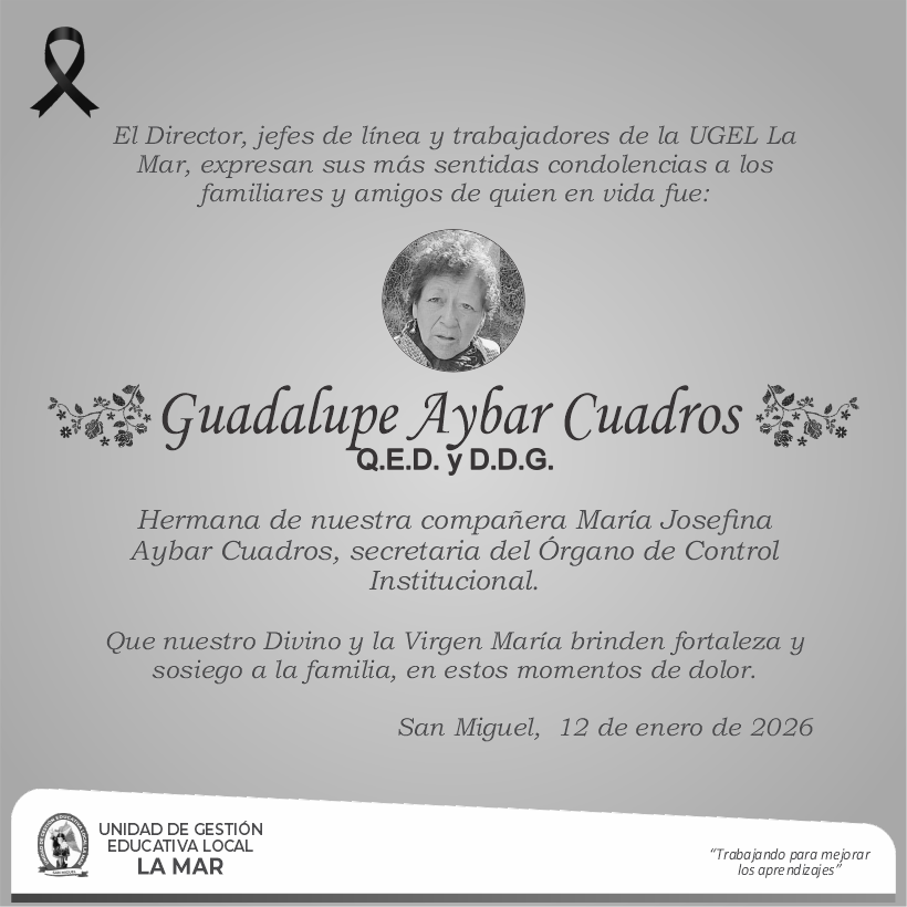 🕊️ La UGEL La Mar expresa sus más sentidas condolencias a los familiares y amigos de quien en vida fue Nieves Lita Verástegui Esquivel, profesional que brindó servicios a nuestra institución y hermana de nuestra compañera Betsabe Berenise Verástegui Esquivel.