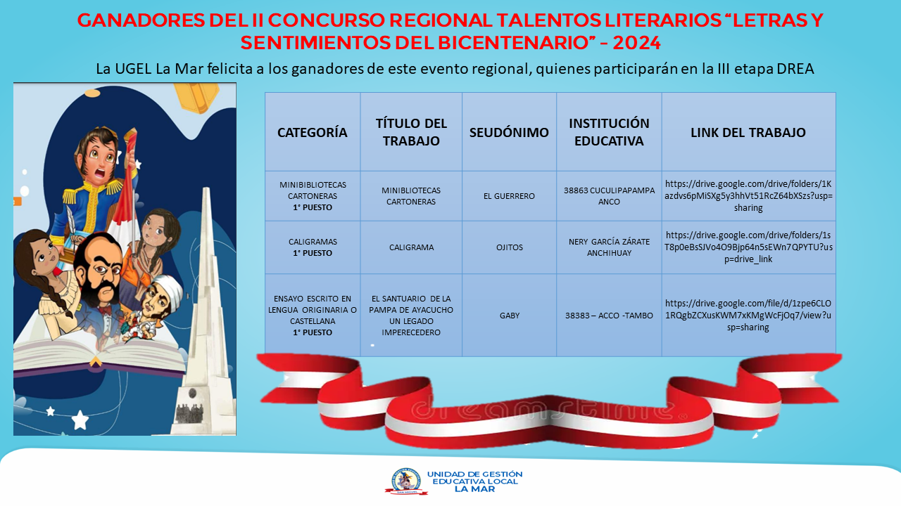 GANADORES DEL II CONCURSO REGIONAL TALENTOS LITERARIOS “LETRAS Y SENTIMIENTOS DEL BICENTENARIO” - 2024