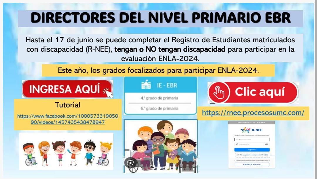 ¡Atención, directores! 🏫 No olviden completar el Registro de Estudiantes con Discapacidad (R-NEE) antes del 24 de junio . 📢 Aseguremos la inclusión de adaptaciones y apoyos para todos los estudiantes en la próxima evaluación nacional. 🧒👦📝
