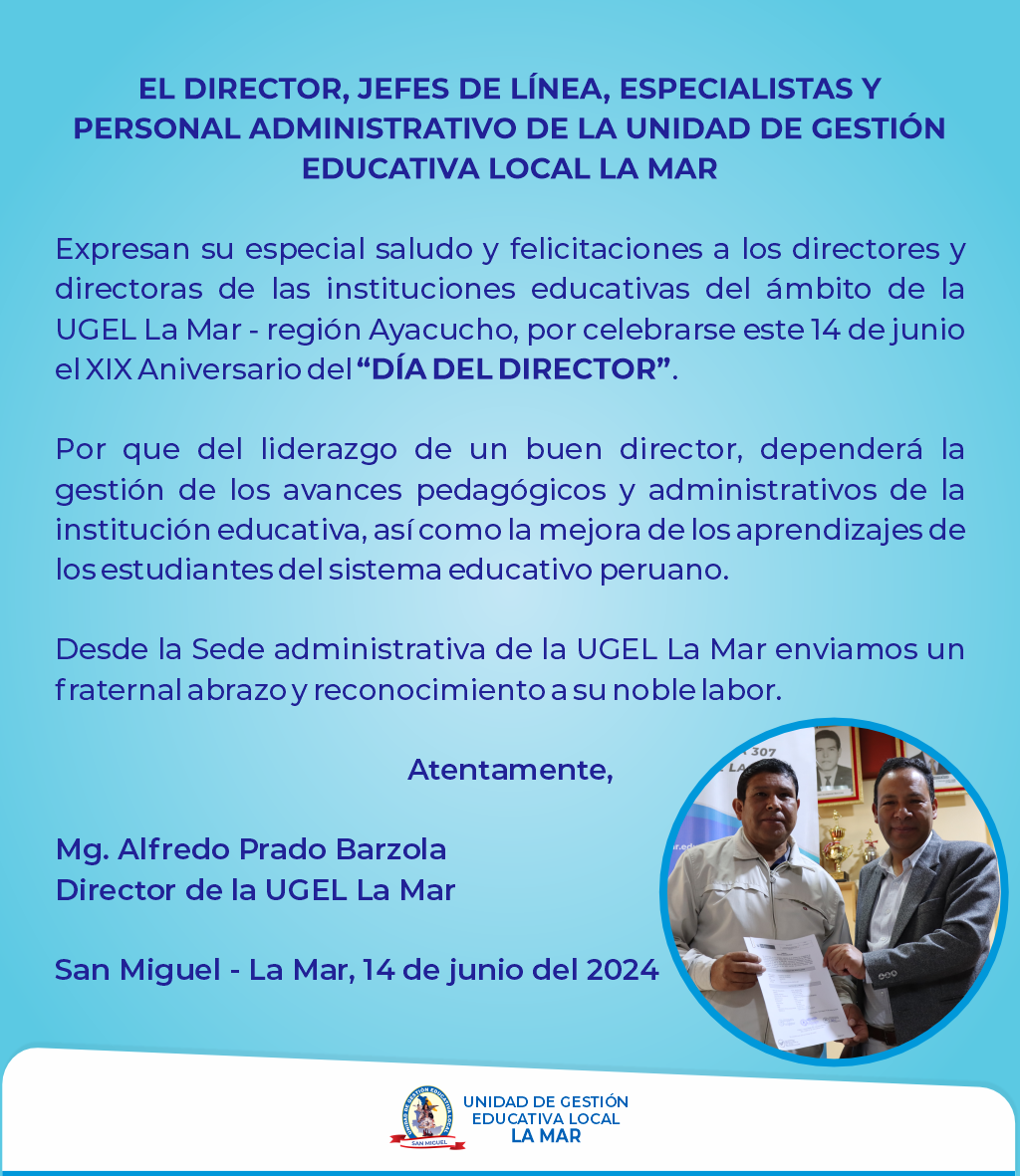 Saludo institucional por el XIX Aniversario del "DÍA DEL DIRECTOR" de las instituciones educativas, públicas y privadas, del ámbito jurisdiccional de la UGEL La Mar, que se celebran hoy este justo homenaje.