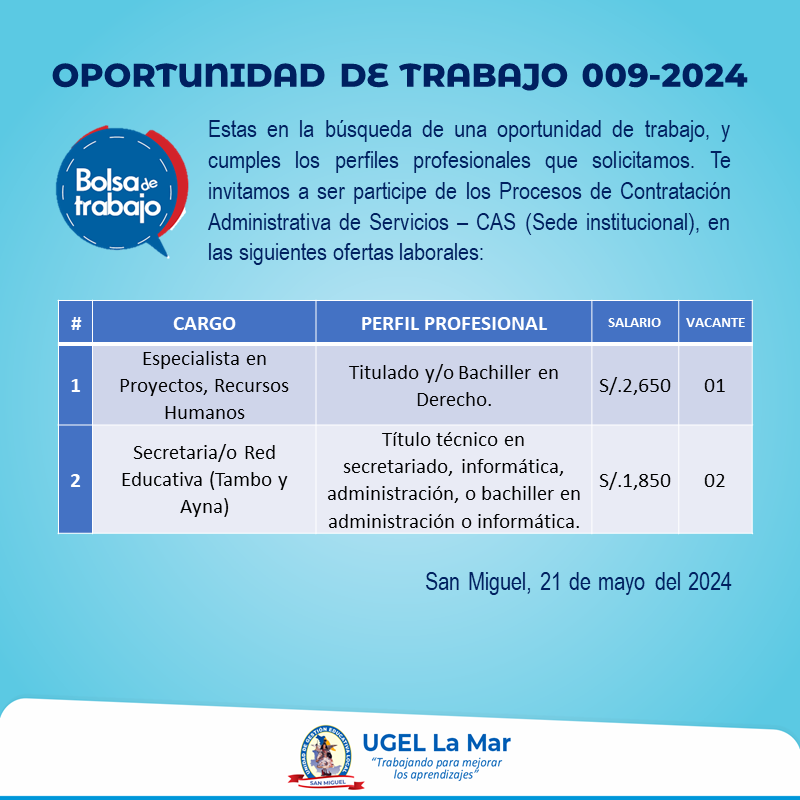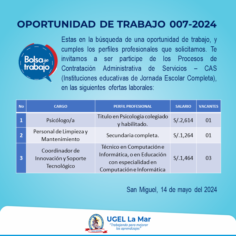👉Estás en la búsqueda de trabajo y deseas brindar servicio en la Sede institucional de la UGEL La Mar ¡Qué esperas, participa de nuestras Convocatorias CAS 2024!