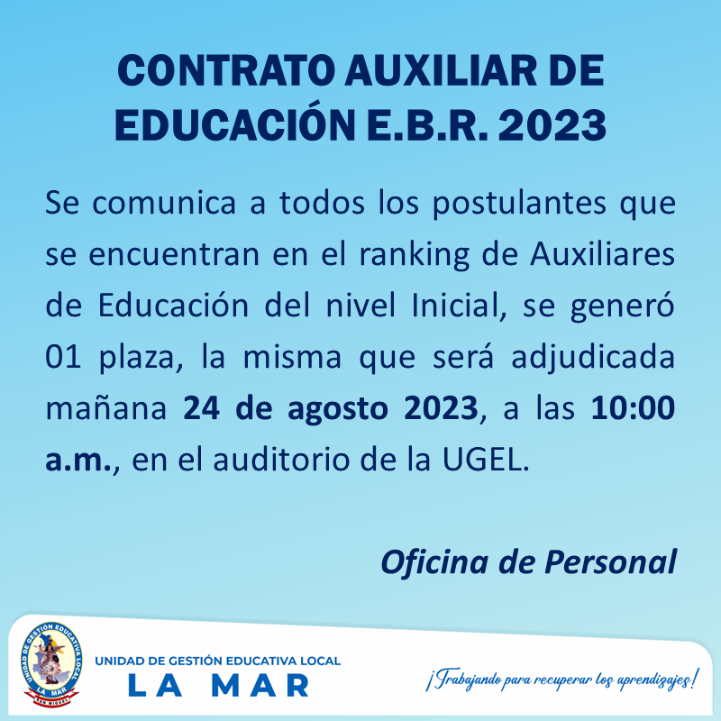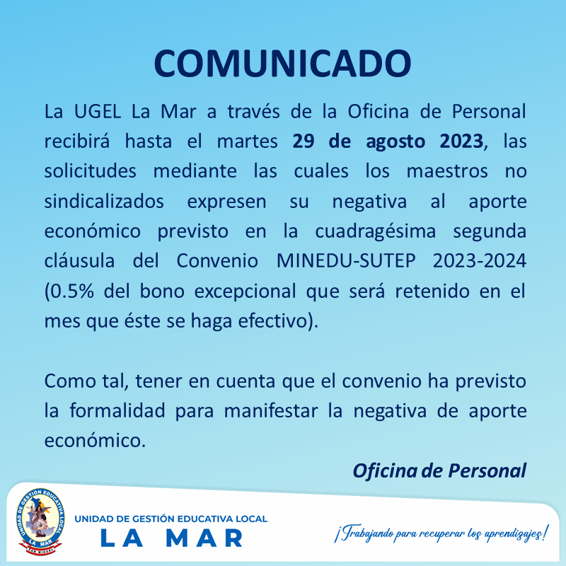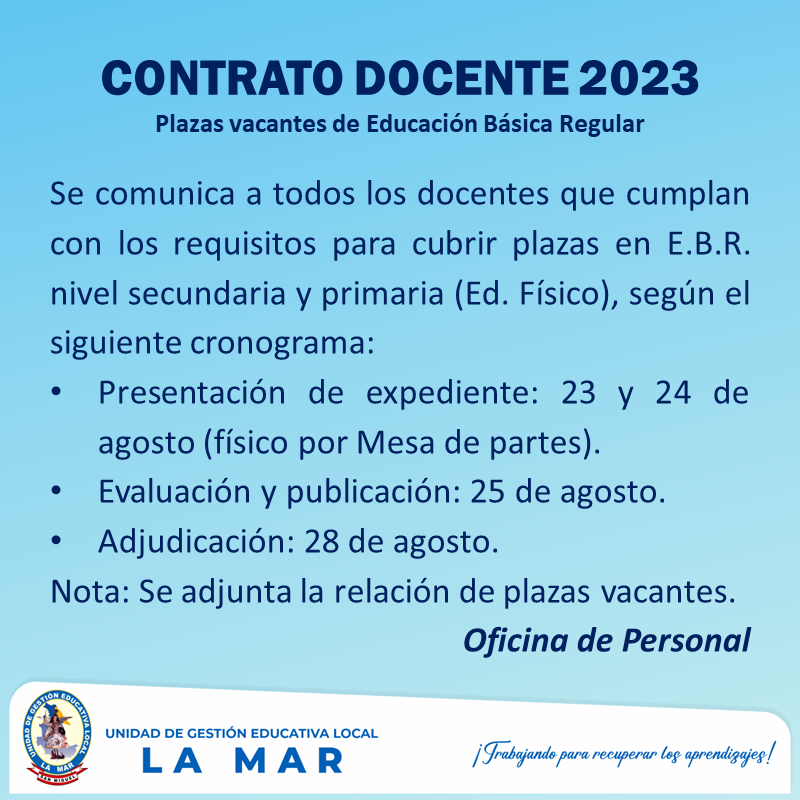 Escrito en 24 Agosto 2023. Visto: 2200 Convoca a reunión virtual para la socialización y reflexión sobre los resultados del monitoreo docente e implementación para la mejora del desempeño.Ver Oficio Múltiple N°191-2023-UGEL-LM: