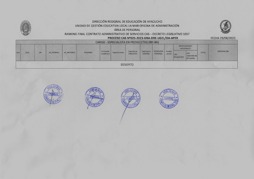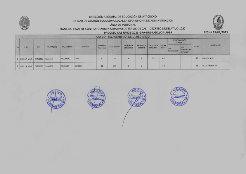 Escrito en 29 Agosto 2023. Visto: 2118 Resultados finales: PROCESO CAS N°026-2023-UGEL-LM (SECRETARIO RED ANCO):