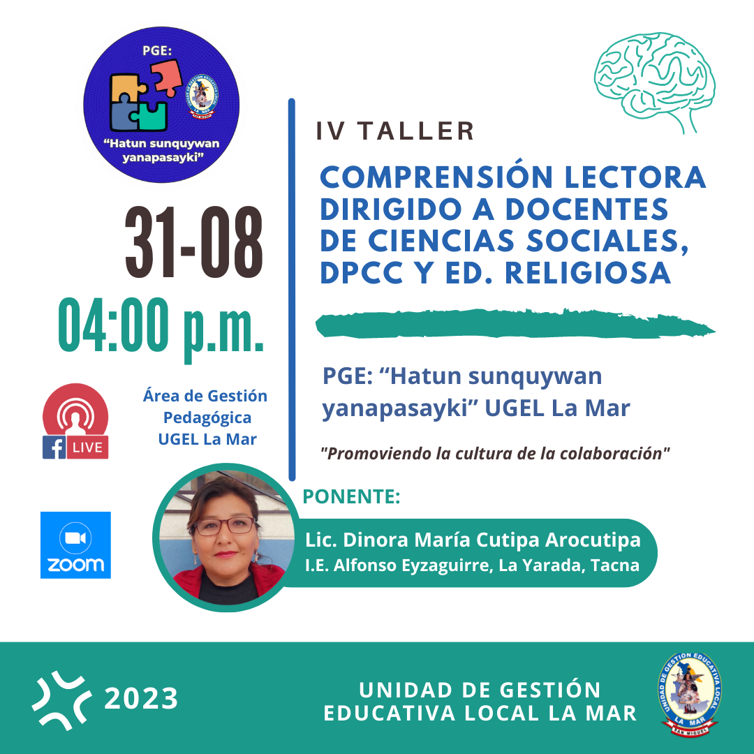 Escrito en 29 Agosto 2023. Visto: 2079 IV Taller de Comprensión Lectora, dirigido a los docentes de Ciencias Sociales, DPCC y Ed. Religiosa