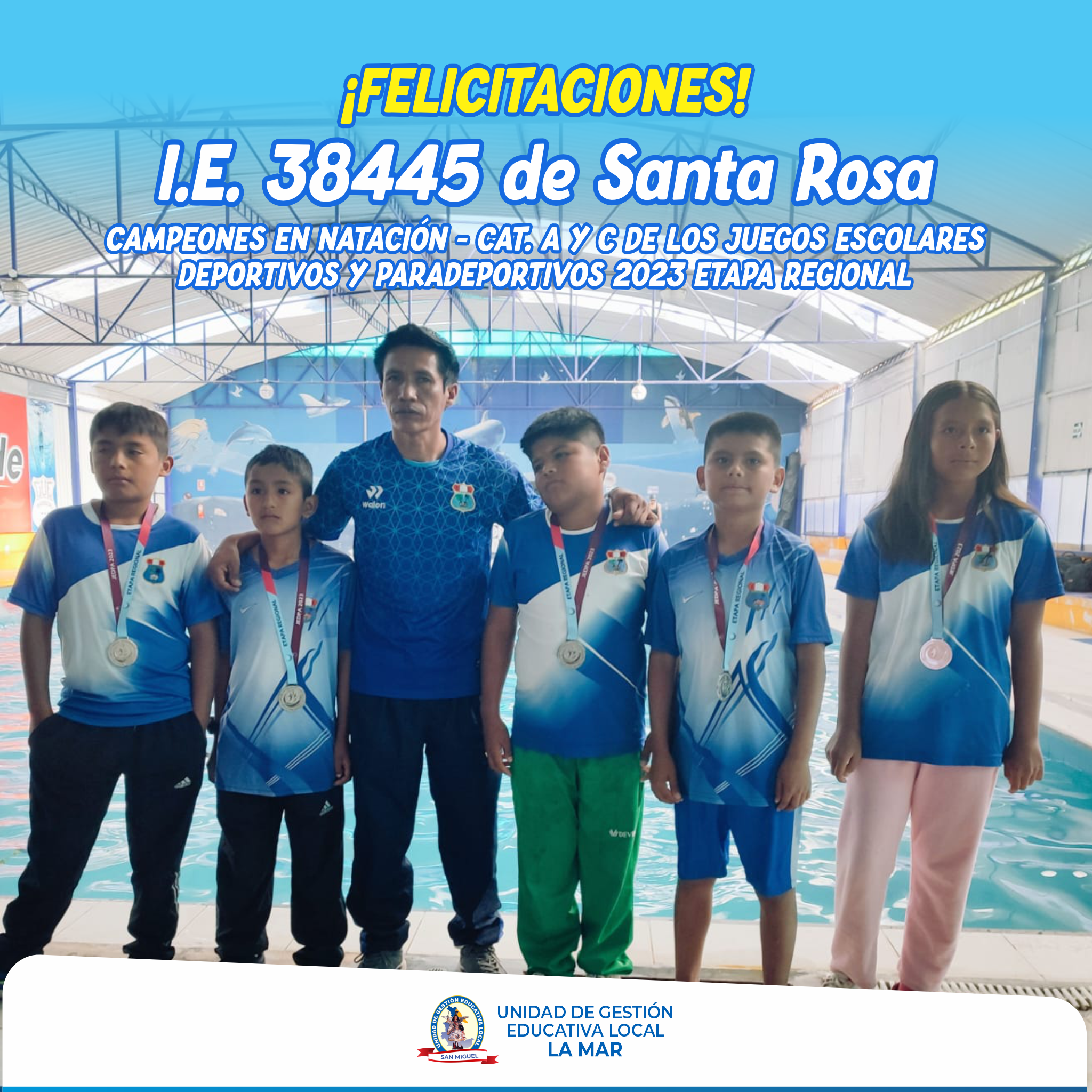 🟦La familia de la UGEL La Mar, felicita y reconoce los logros obtenidos por la I.E. N°38445 de Santa Rosa, campeones - medallistas en la disciplina de Natación, en las categorías “A y C” de los Juegos Escolares Deportivos y Paradeportivos 2023 – Etapa regional.