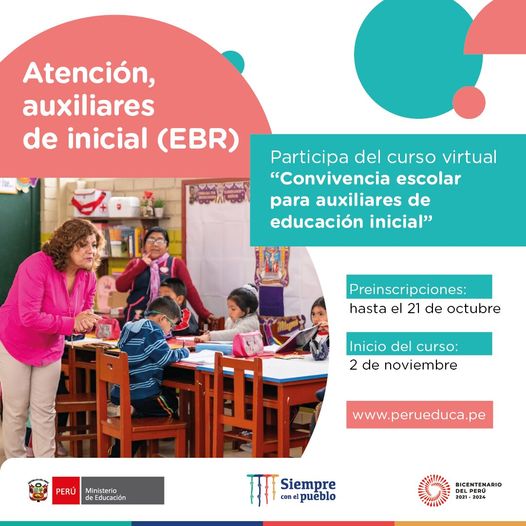 ¡Atención, auxiliares de educación inicial! Si en el 2021 no pudieron llevar el curso virtual “Convivencia escolar para auxiliares de educación inicial”, ahora pueden preinscribirse hasta el 21 de octubre.