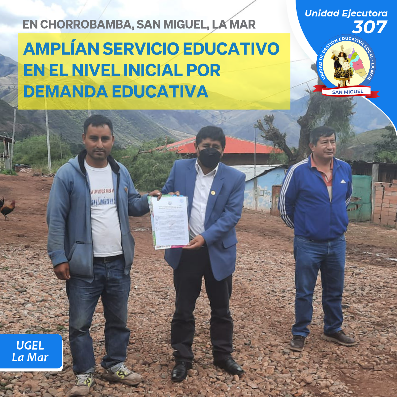 Ante la existencia considerable de niños y niñas en educación inicial, y la necesidad de contar con el servicio educativo en el nivel inicial, directivos de la UGEL La Mar, autoridades y padres de familia de la comunidad de Chorrobamba, del distrito de San Miguel, La Mar; impulsan acciones para la creación de la I.E. Inicial 38818/Mx-U por modalidad de ampliación del servicio educativo dentro de la I.E. Primaria 38818/Mx-P del lugar.
