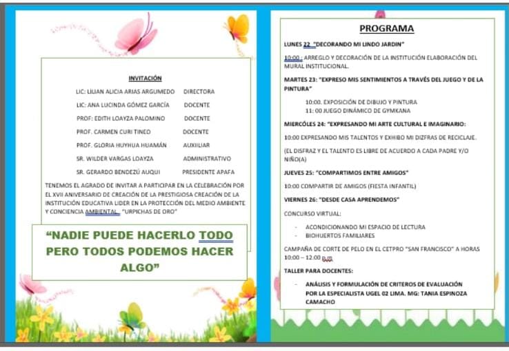 UGEL La Mar envía un caluroso y fraterno saludo a la I.E. N°424/Mx-P "URPICHAS DE ORO", por su Décimo Séptimo Aniversario de vida Institucional.
