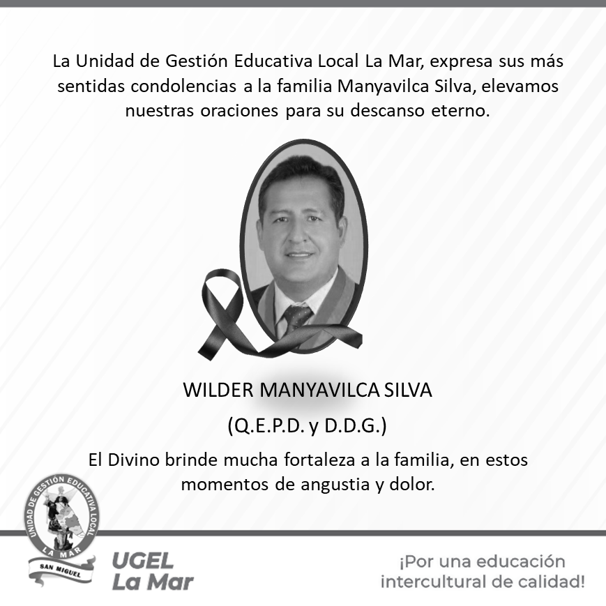 #SentidasCondolencias La UGEL La Mar acompaña a la familia Manyavilca Silva, en el inmenso dolor por la pérdida de Wilder Manyavilca Silva (Alcalde Provincial de La Mar), elevamos nuestras oraciones para su descanso.