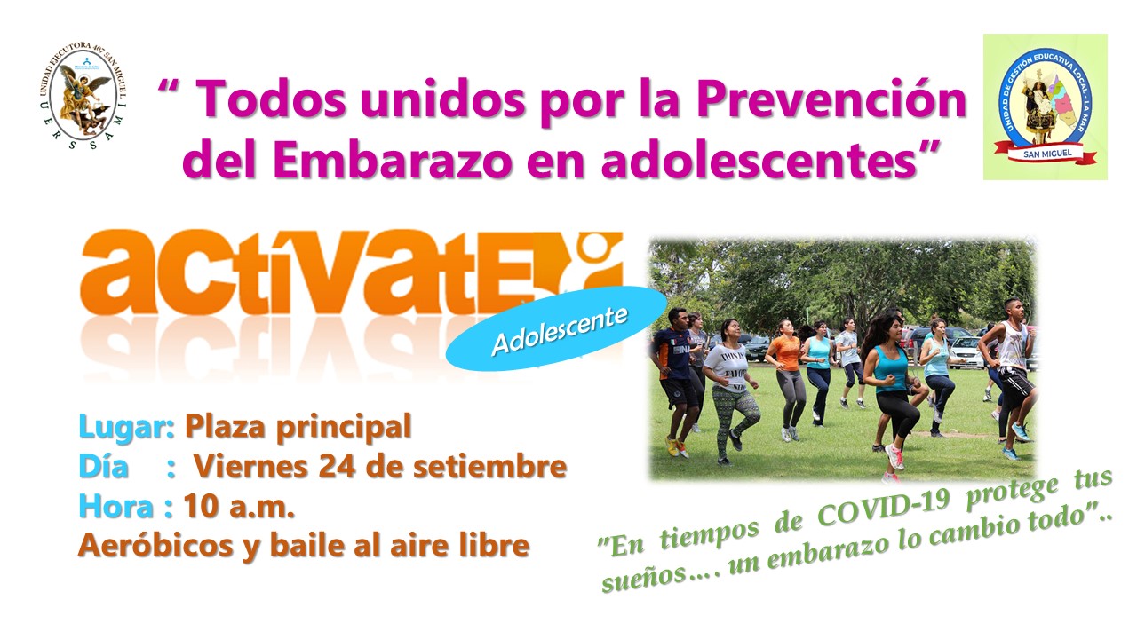 LA UNIDAD DE GESTIÓN EDUCATIVA LOCAL LA MAR Y UNIDAD EJECUTORA RED DE SALUD SAN MIGUEL, les invita a participar en ACTÍVATE ADOLESCENTE “Todos unidos por la prevención del Embarazo en adolescentes”