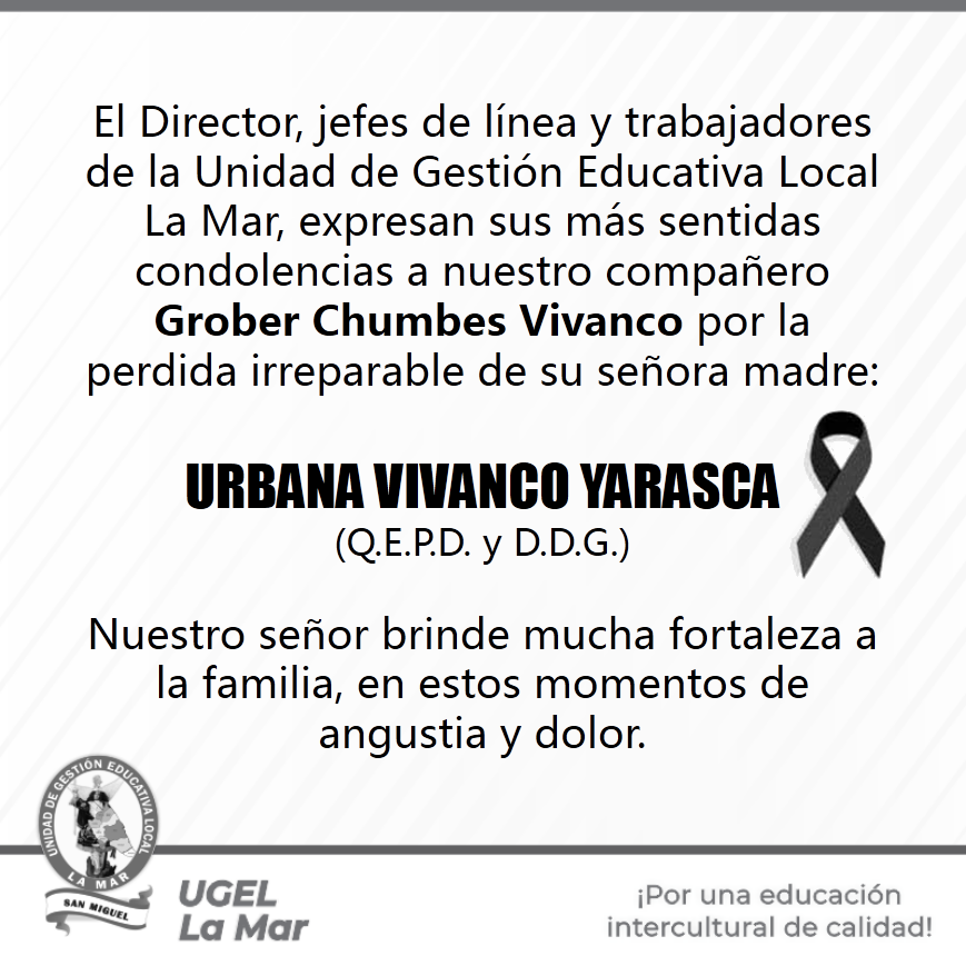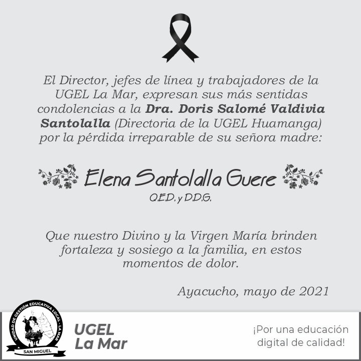 Nuestras más sentidas condolencias a la Dra. Doris Salomé Valdivia Santolalla (Directora de la UGEL Huamanga), por la irreparable pérdida de su señora madre.