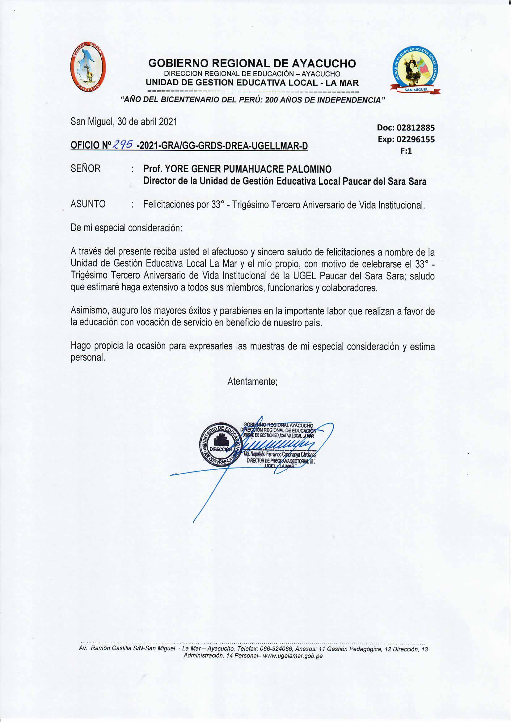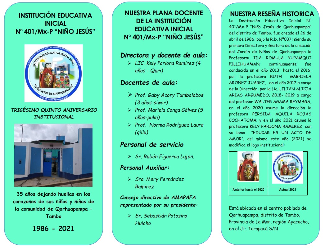 #AniversarioInstitucional La UGEL La Mar envía un afectuoso saludo a toda la familia educativa de la I.E.I. N°401/Mx-P "Niño Jesús", por su Trigésimo Quinto Aniversario Institucional, en especial a la directora y plana docente.