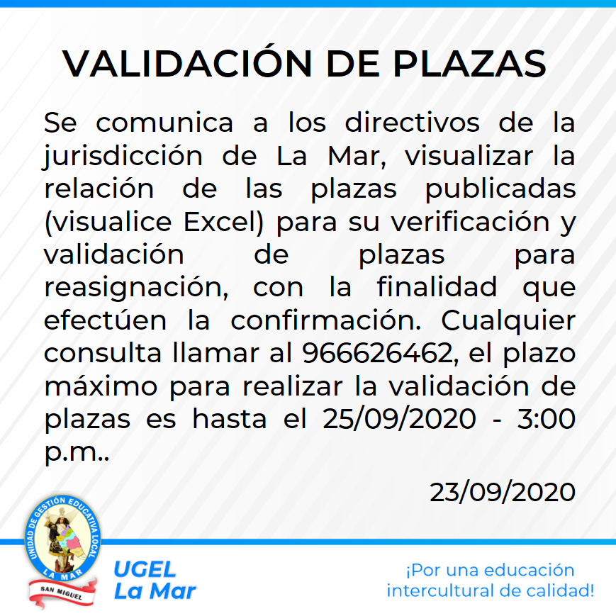 Señor@s directivos del ámbito de la provincia de La Mar, verificar y validar plazas para reasignación.