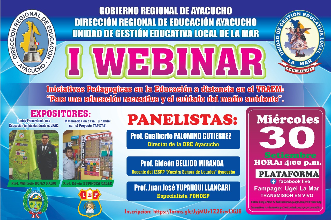 Actividad que expondrá las iniciativas pedagógicas en la educación a distancia desarrolladas en el VRAEM. ¡No te lo pierdas! recuerda la cita será este miércoles 30 de setiembre, 4:00 p.m., transmisión en vivo por el fanpage.