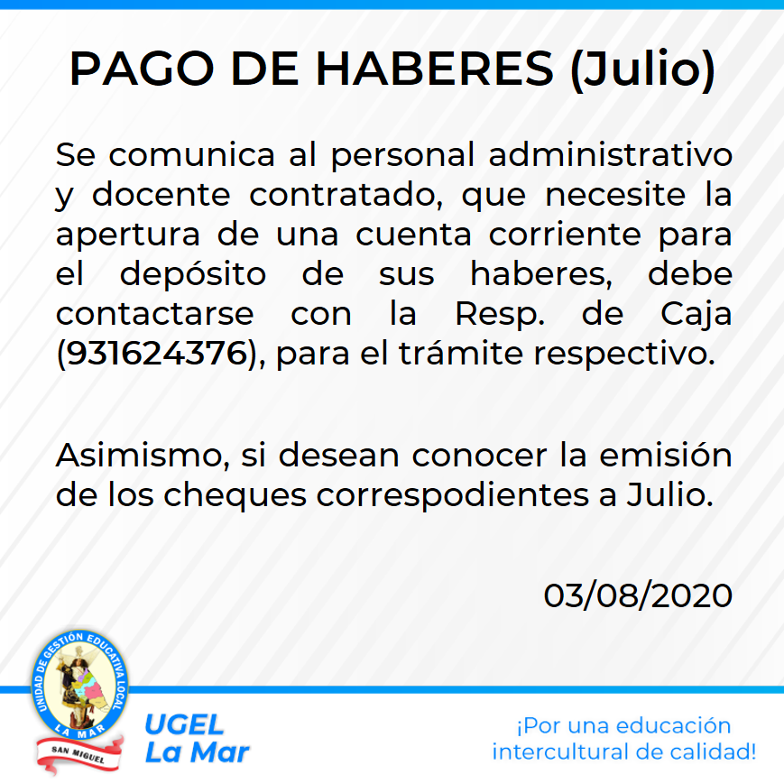 Si necesitas la apertura de una cuenta de ahorros para el pago de tu sueldo, o consultar si tu cheque se emitió, comunícate al 931624376.