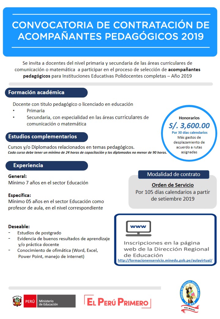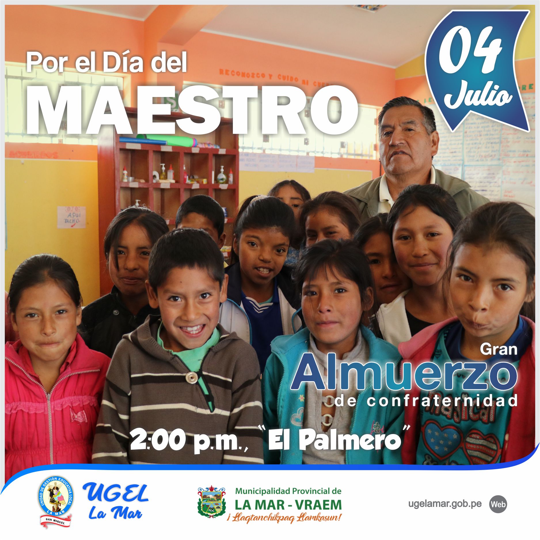 La Municipalidad Provincial de La Mar, y la UGEL La Mar se complacen en invitar a los maestros y maestras del distrito de San Miguel, al Gran almuerzo de confraternidad, desarrollado con motivo del Día del Maestro. Jueves 04 de julio, desde las 2:00 p.m., en el local "El Palmero".