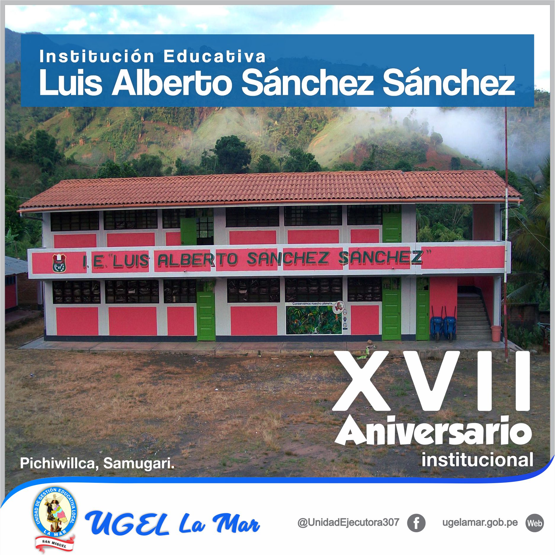 Un fraterno y caluroso saludo a la familia de la I.E. Luis Alberto Sánchez Sánchez, en este XVII aniversario de vida institucional. Muchos éxitos y parabienes a directivos, plana docente, administrativos, estudiantes y padres de familia de esta prestigiosa institución.