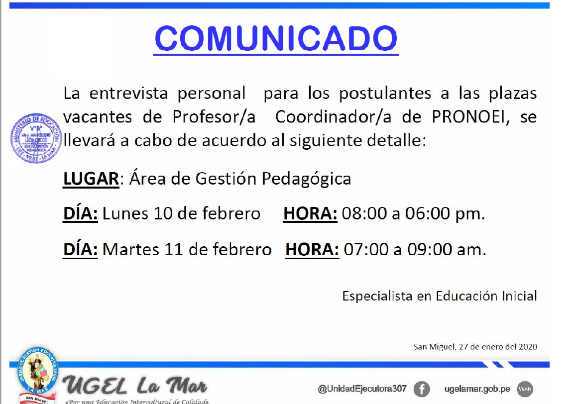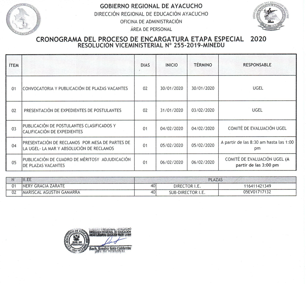 Escrito en 31 Enero 2020. Visto: 3258 RESULTADOS FINALES PARA PROCESO DE CONTRATACIÓN DE AUXILIARES DE EDUCACIÓN 2020 DESCARGAR CRONOGRAMA DESCARGAR PLAZAS VACANTES (Actualizado al 17/02/2020) COMUNICADO