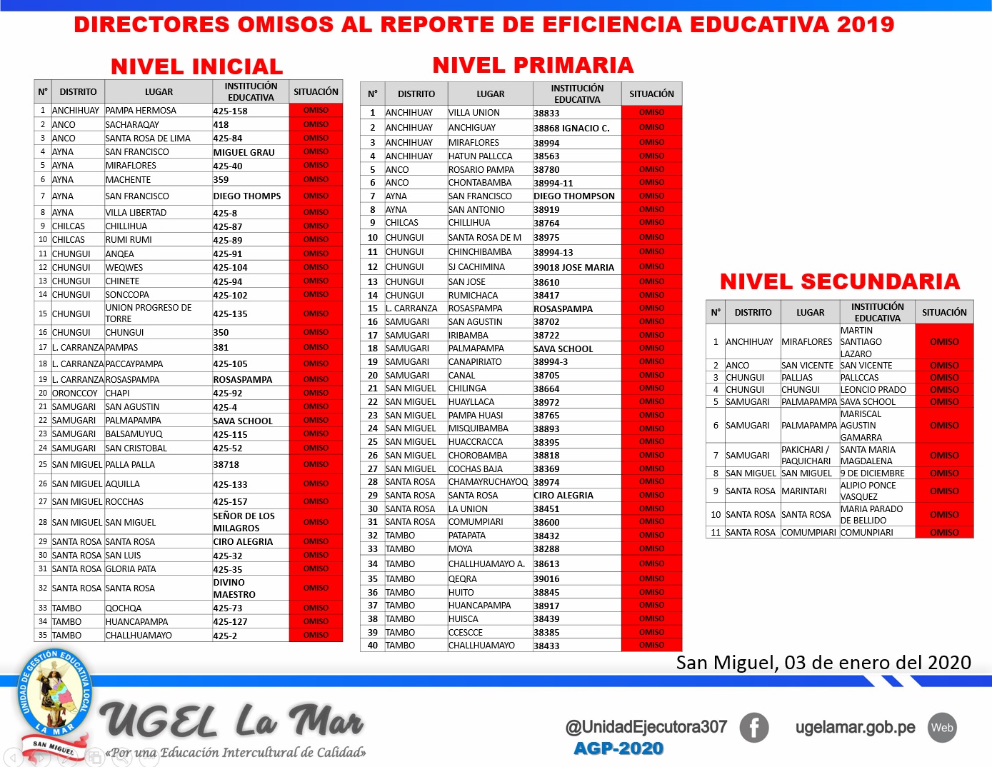 Escrito en 06 Enero 2020. Visto: 3266 AL 07/12/2020 LISTA DE OMISOS AL INFORME DE GESTIÓN ESCOLAR ANUAL 2019 NIVEL SECUNDARIA LISTA DE OMISOS AL INFORME DE TUTORÍA 2019 NIVEL INICIAL. NIVEL PRIMARIA. NIVEL SECUNDARIA.