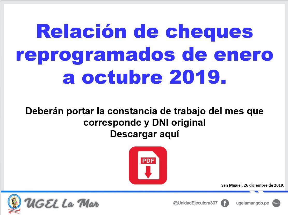 Los cheques se encuentran a una semana de su vencimiento, para su recojo deberan presentar su constancia de trabajo del mes que corresponde y DNI original, en caso de terceros una carta poder firmado por un Juez de Paz.