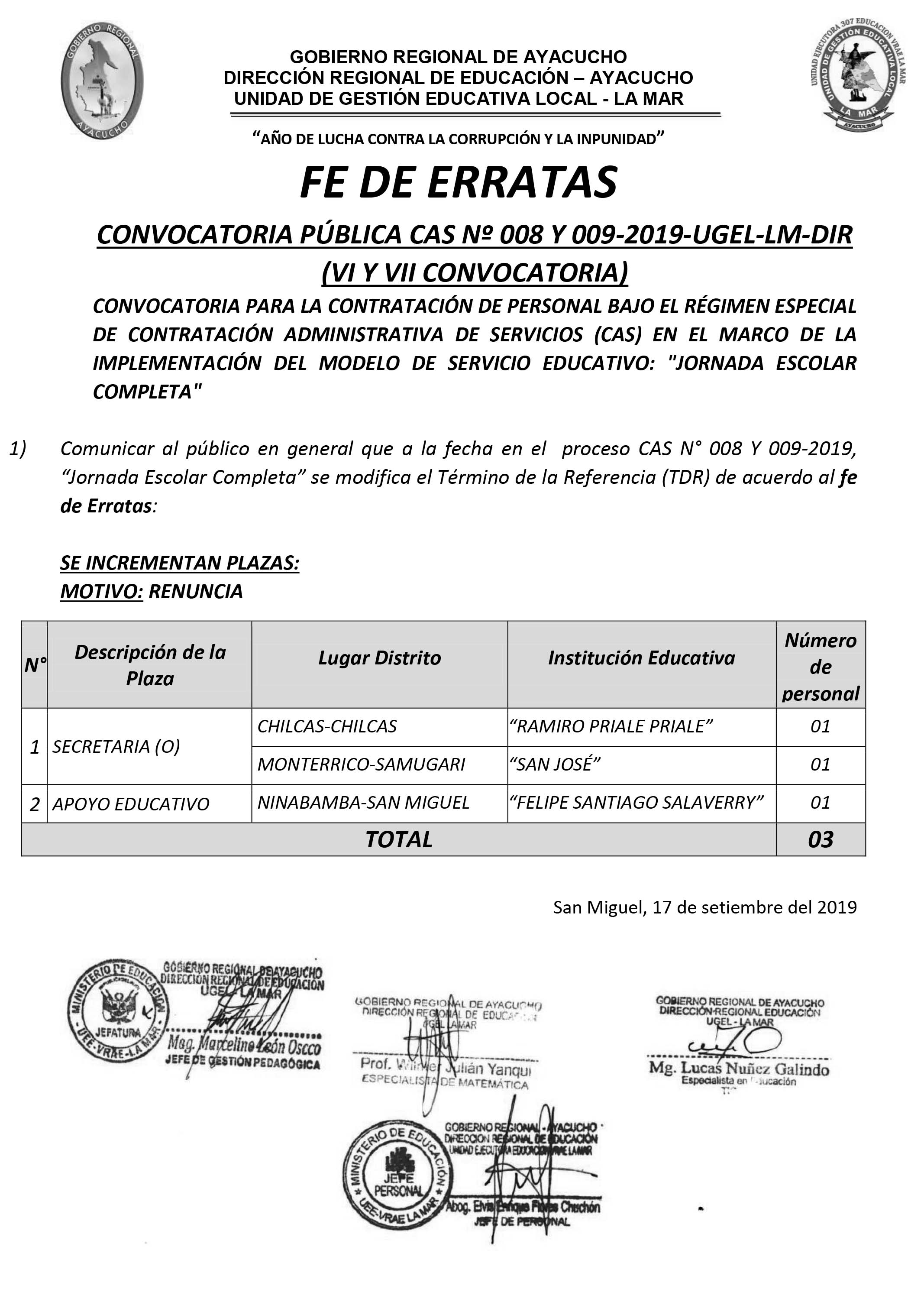 Escrito en 17 Septiembre 2019. Visto: 3230 Fe de Erratas CAS N° 008 y 009-2019 (VI Y VII Convocatoria)