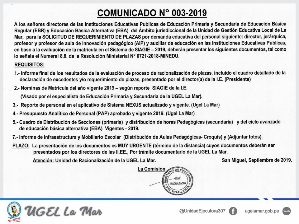 04 de setiembre║Buscando garantizar el acceso al servicio educativo de las poblaciones más vulnerables de la provincia La Mar, autoridades del sector educación otorgan en ceremonia especial Resolución Directoral N°38994-19, autoriza la creación de la I.E. del nivel inicial N° 38994-19, en Las Malvinas, distrito de Chungui.
