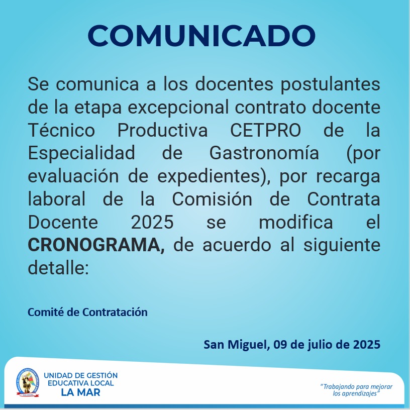 ETAPA EXCEPCIONAL CONTRATO DOCENTE TÉCNICO PRODUCTIVA CETPRO: PROFESOR EN LA ESPECIALIDAD DE GASTRONOMÍA (POR EVALUACIÓN DE EXPEDIENTES)