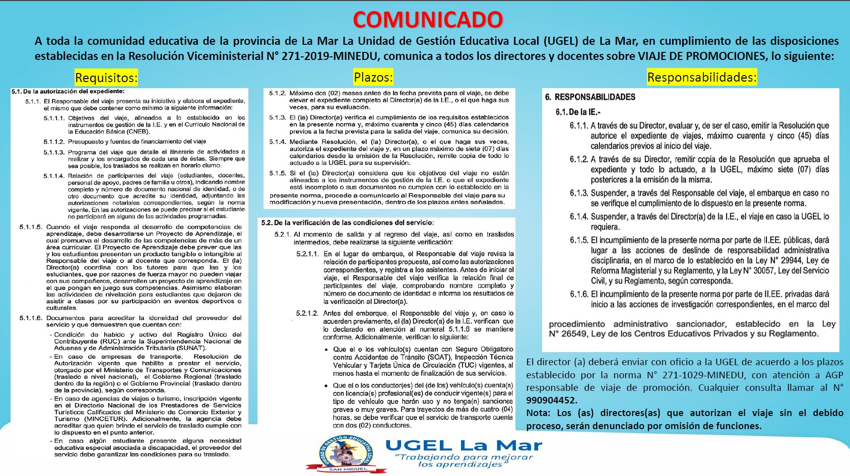 A toda la comunidad educativa de la provincia de La Mar La Unidad de Gestión Educativa Local (UGEL) de La Mar, en cumplimiento de las disposiciones establecidas en la Resolución Viceministerial N° 271-2019-MINEDU, comunica a todos los directores y docentes sobre VIAJE DE PROMOCIONES, lo siguiente: