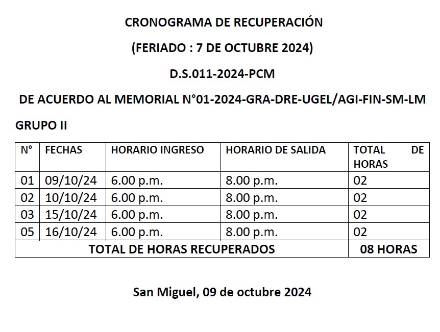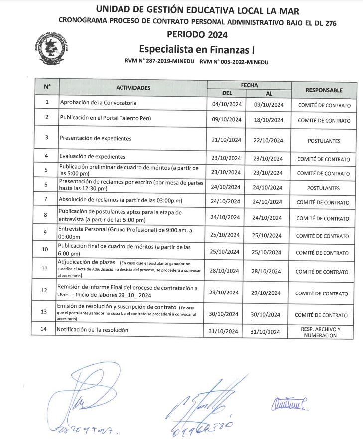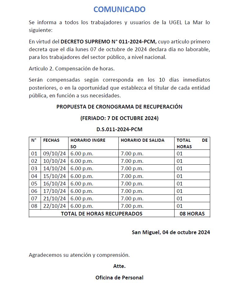 SE LES COMUNICA A TODOS LOS DOCENTES QUE SE ENCUENTRAN EN EL RANKING DE EVALUACIÓN DE EXPEDIENTES EBR NIVEL SECUNDARIA, DEL ÁREA DE CIENCIA Y TECNOLOGÍA QUE LA ADJUDICACIÓN DE PLAZA GENERADA A LA FECHA, SE REALIZARÁ EL DÍA VIERNES 11 DE OCTUBRE DE 2024 A HORAS 09:00 AM EN EL AUDITÓRIUM DE LA UGEL LA MAR.