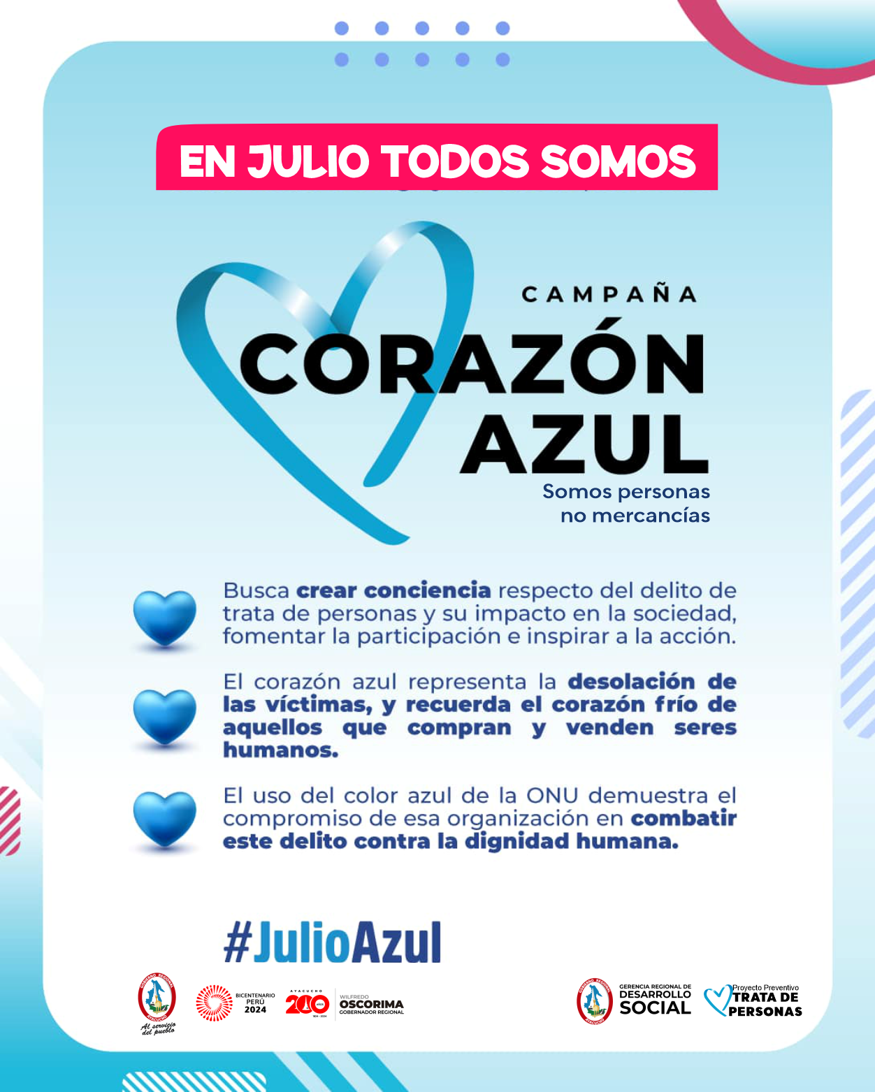 #YoMeSumoAlCorazónAzul buscar incentivar a la población a que se informe sobre la trata, identifique situaciones de riesgo y apoye a erradicar este flagelo social a través de sus denuncias oportunas.