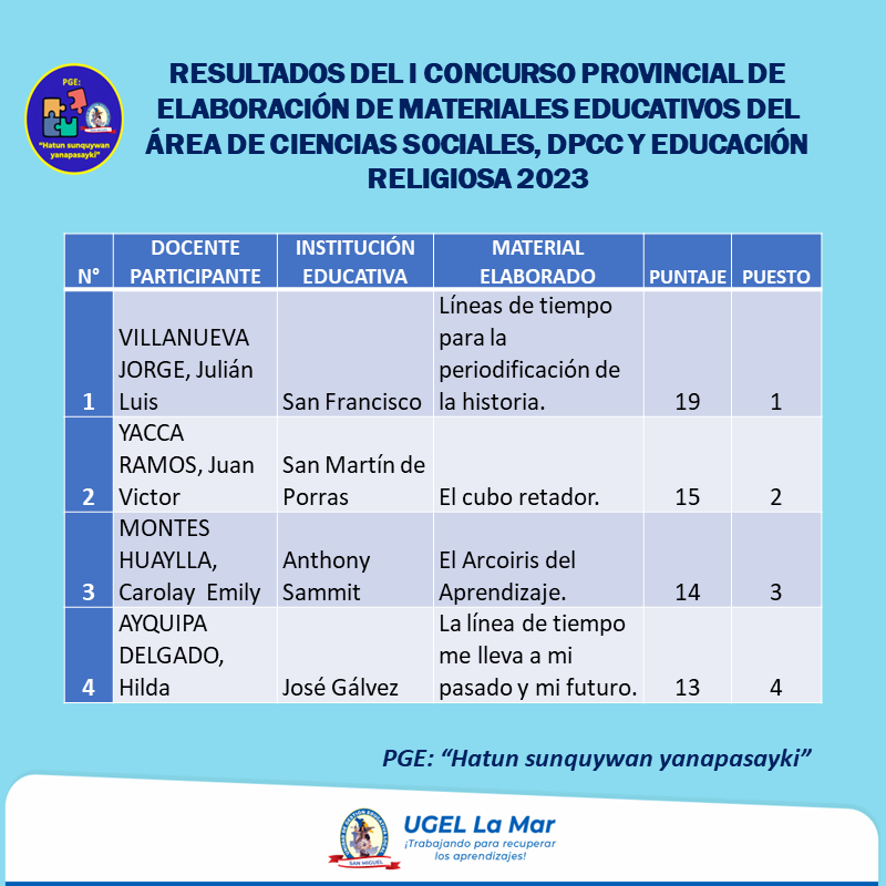 ✅RESULTADOS: I Concurso de Elaboración de Materiales Educativos para las áreas de CCSS,DPCC y Educación Religiosa