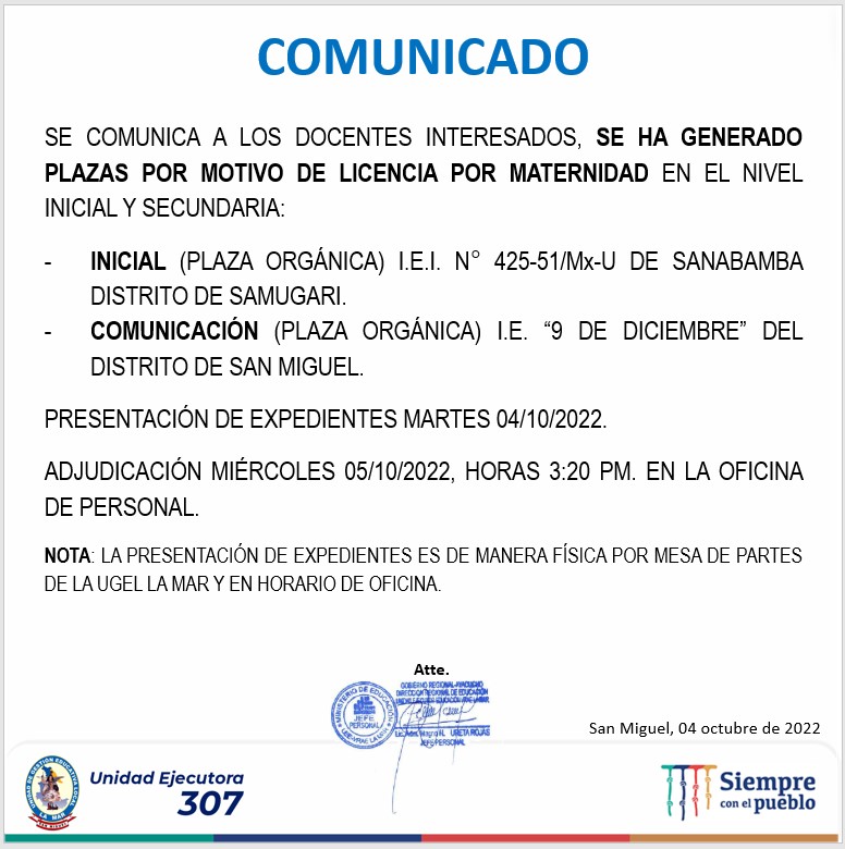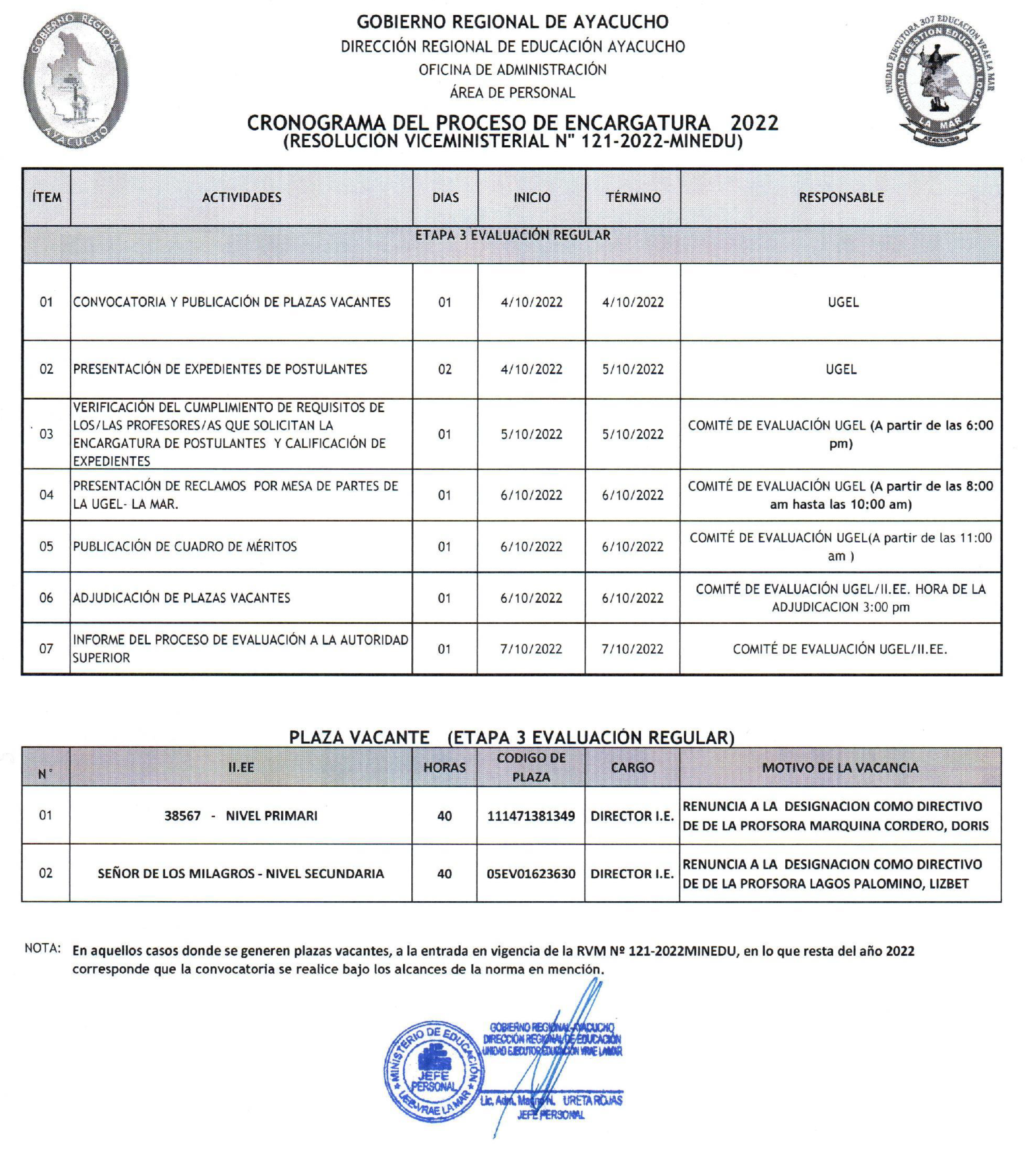 RELACIÓN DE PLAZAS VACANTES ETAPA 2 PROMOCIÓN INTERNA DE CARGOS DIRECTIVOS, JERÁRQUICOS Y DE ESPECIALISTAS EN FORMACIÓN DOCENTE (RESOLUCIÓN VICEMINISTERIAL N°121-2022-MINEDU) ![]()