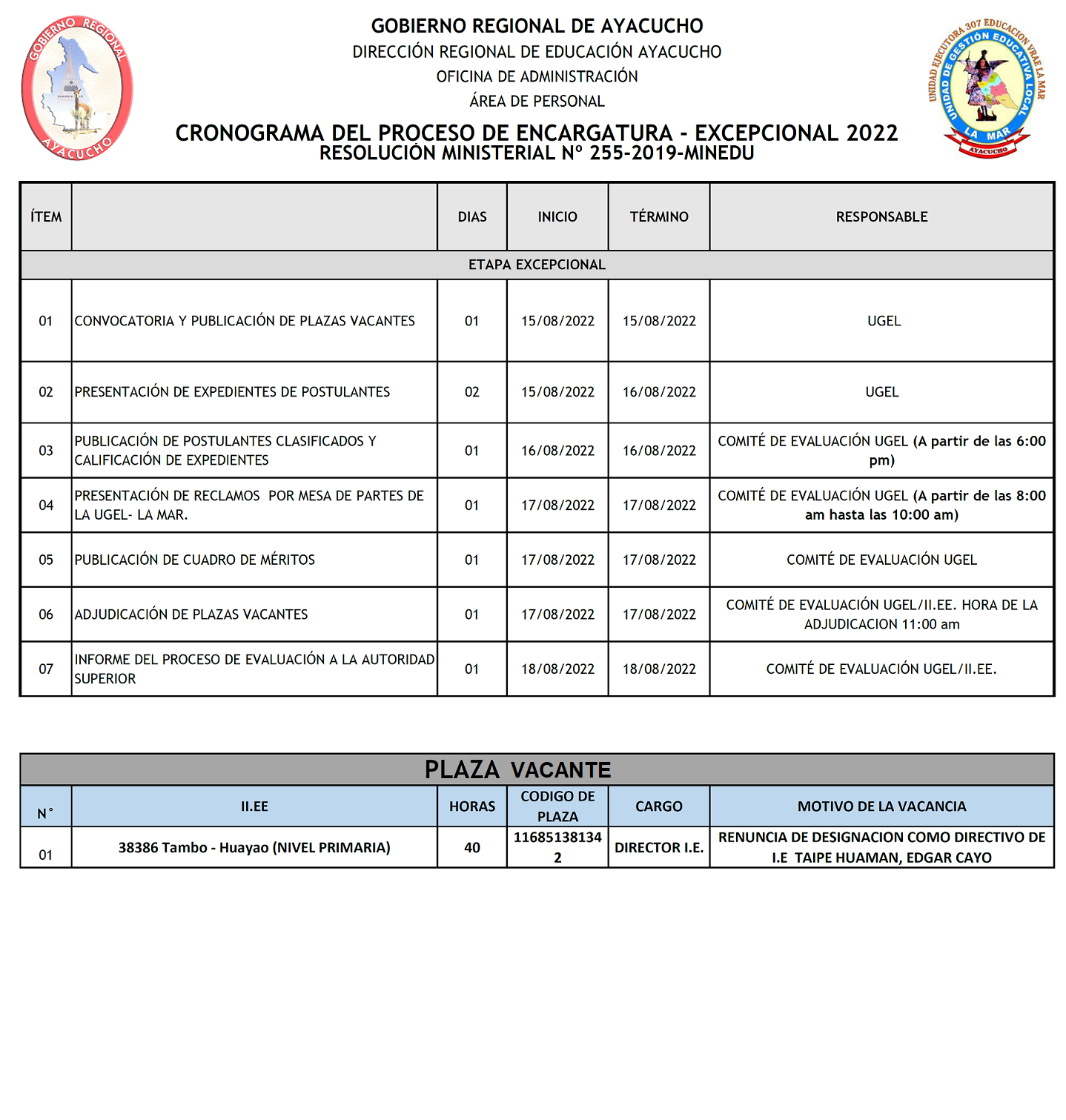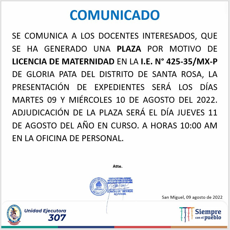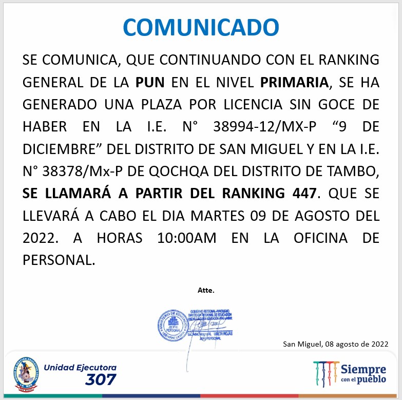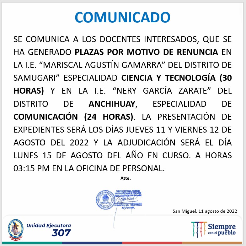 Resultados de la evaluación de expedientes para cubrir plazas de Comunicación y Ciencia y Tecnología, así mismo la adjudicación se llevará a cabo el día 16/08/2022 en la oficina de personal de la UGEL La Mar, a las 10:00am.