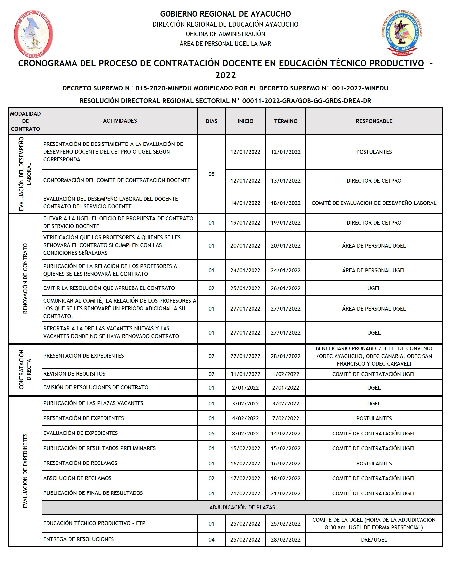 Escrito en 12 Enero 2022. Visto: 3643 Cronograma para el Proceso de Contrato Docente en Educación Básica Regular Cronograma para el Proceso de Contrato Docente en Educación Técnico Productiva.