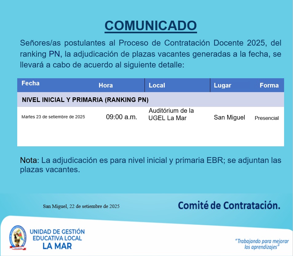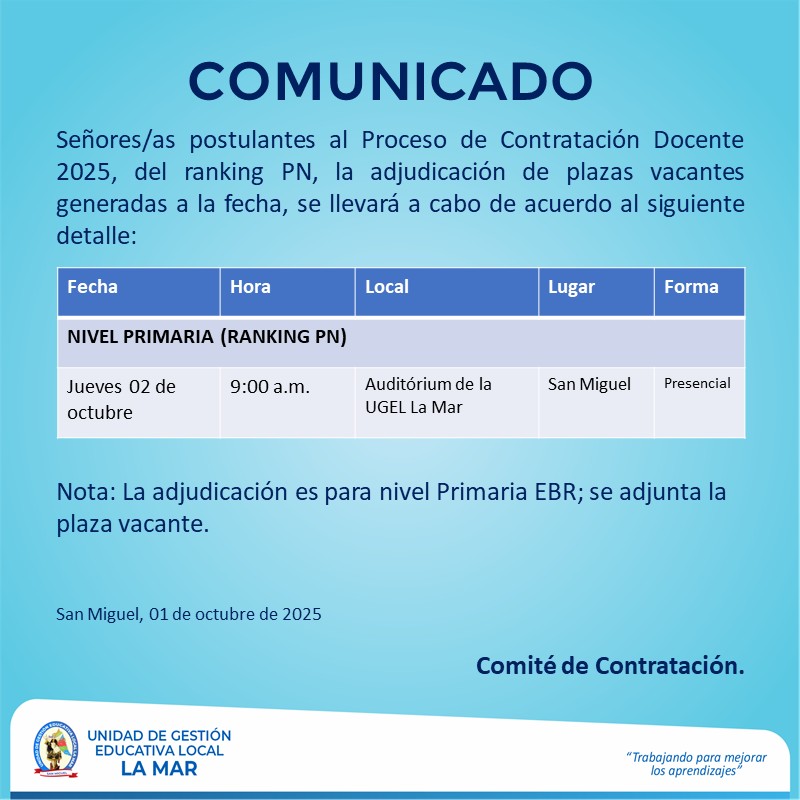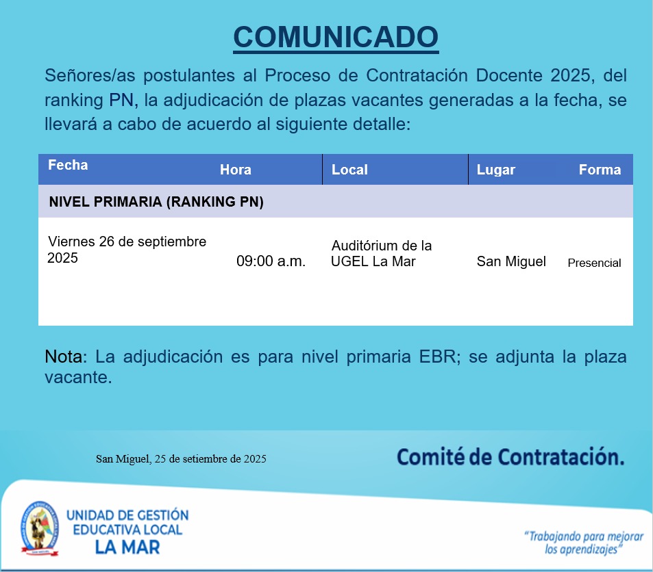 Escrito en 17 Septiembre 2025. Visto: 635 CRONOGRAMA PARA LA CONTRATACIÓN DOCENTE 2025 ETAPA EXCEPCIONAL CONTRATO DOCENTE EBR: CIENCIAS SOCIALES (POR EVALUACIÓN DE EXPEDIENTES) VER CRONOGRAMA AQUÍ VER PLAZA AQUÍ