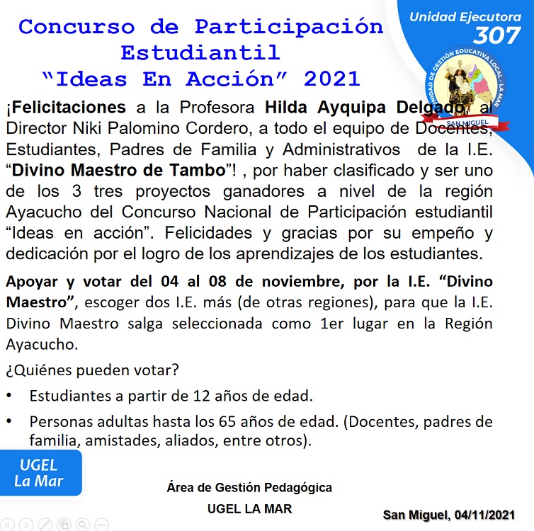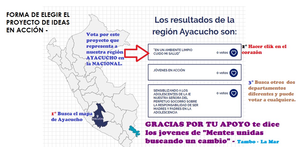 Tu apoyo es importante, hagamos que el proyecto EN UN AMBIENTE LIMPIO CUIDO MI SALUD, implementado por los estudiantes de la I.E. Divino Maestro, continúe avanzando a la siguiente etapa del Concurso Nacional de Ideas en Acción. Apóyanos con tu voto ingresando al siguiente link: