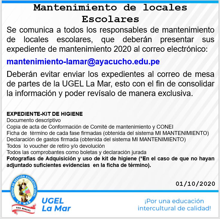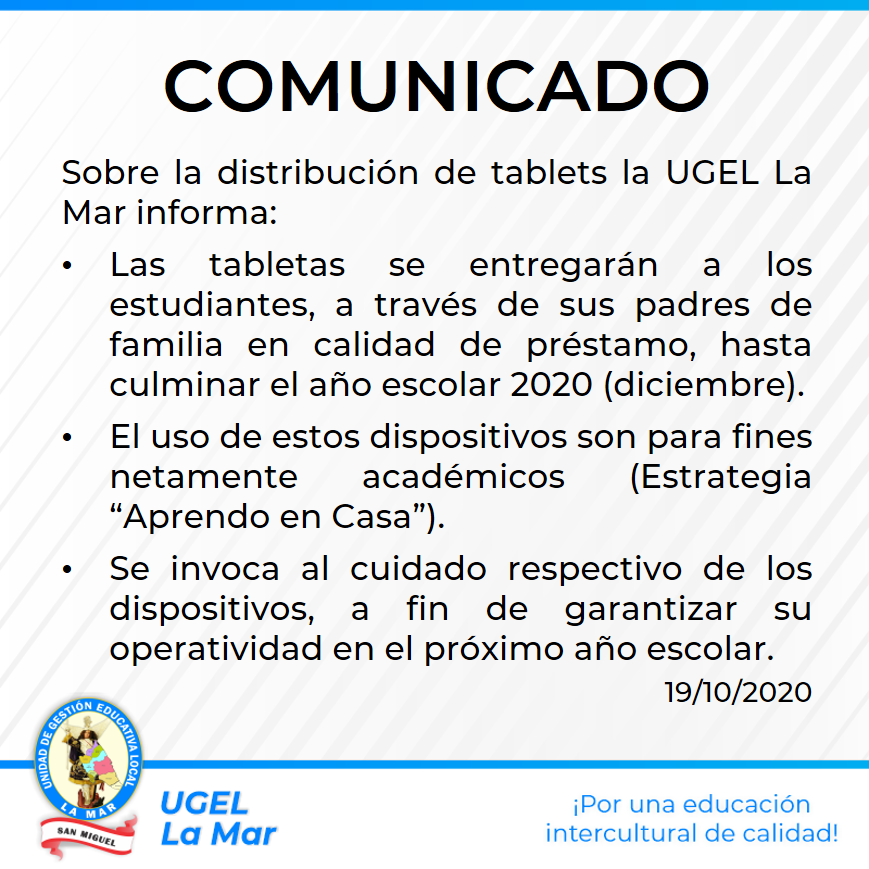 Desde inicios de octubre, la Unidad de Gestión Educativa Local de La Mar, comenzó con los trabajos de distribución de tabletas, a dieciséis instituciones educativas focalizadas de los distritos de: San Miguel, Tambo, Ayna, Santa Rosa, Samugari, Anco, Chungui y Chilcas en la provincia de La Mar (región Ayacucho).