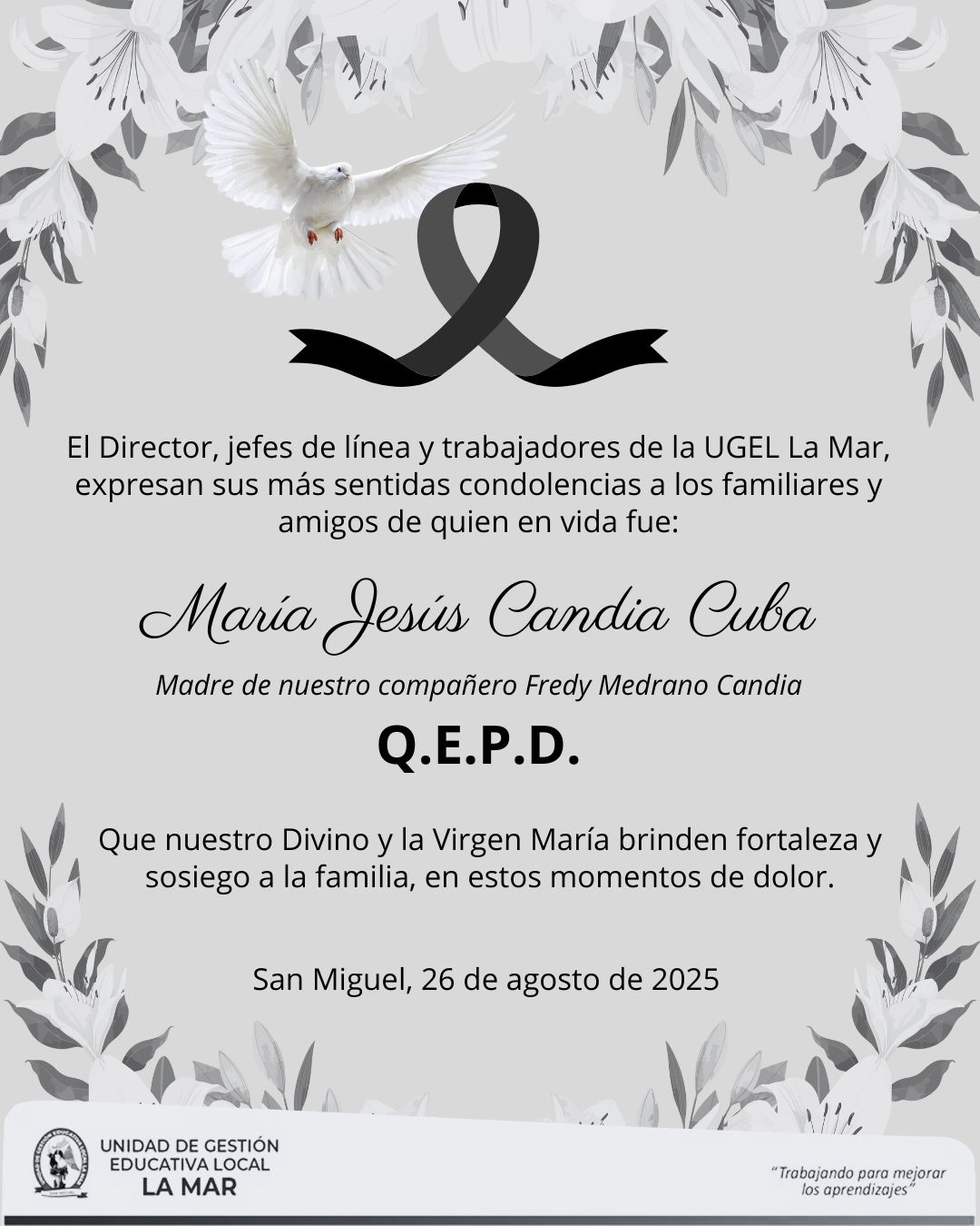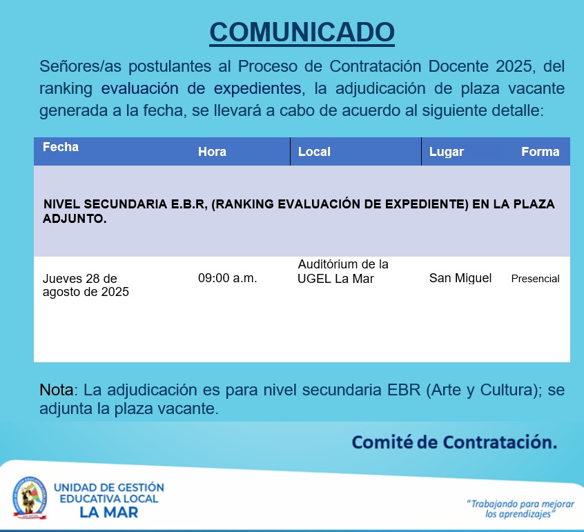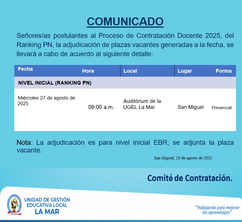 Escrito en 22 Agosto 2025. Visto: 587 TERMINOS DE REFERENCIA PARA LA CONTRATACIÓN DE CONSULTORIA PARA LA FORMULACIÓN DEL PROYECTO EDUCATIVO LOCAL DE LA UGEL LA MAR 2025-2035.