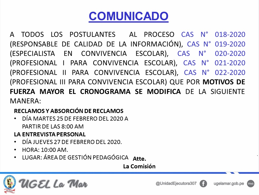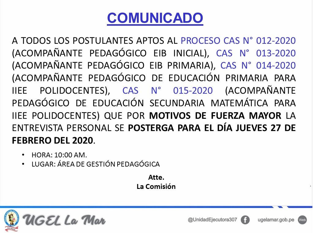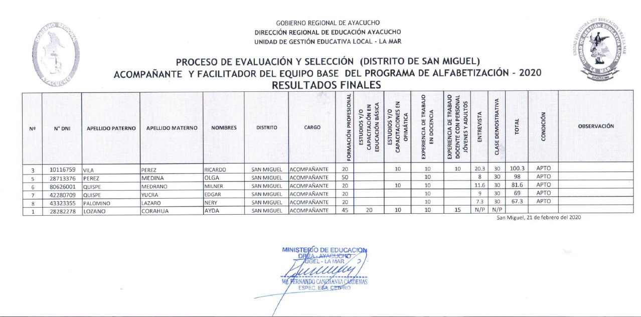 Escrito en 25 Febrero 2020. Visto: 2953 RESULTADOS FINALES DEL PROCESO DE EVALUACIÓN Y SELECCIÓN DE COORDINADOR DISTRITAL Y FACILITADOR DEL EQUIPO BASE DEL PROGRAMA DE ALFABETIZACIÓN 2020 DISTRITO DE SAN FRANCISCO