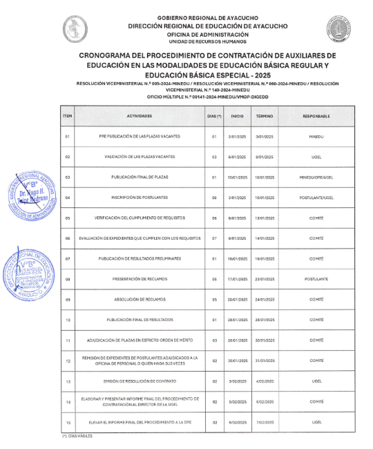 Se comunica a todos los postulantes que se encuentran en el Ranking de Evaluación de Expediente - Auxiliar de Educación, que la adjudicación de las plazas generadas a la fecha en el Nivel de Educación Secundaria E.B.R., se realizará el día jueves 08 de agosto de 2024, a las 09:00 a.m., en el auditórium de la UGEL La Mar.