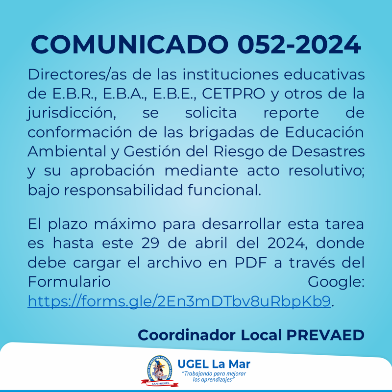 Solicita reporte de conformación de las brigadas de Educación Ambiental y Gestión del Riesgo de Desastres y su aprobación mediante acto resolutivo (R.D.)