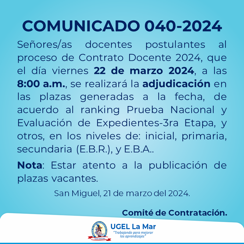 Nota: La adjudicación se llevará a cabo, este miércoles 20/03/2024 a las 11:00 a.m. de la mañana, en los niveles de inicial, primaria, secundaria, E.B.A. y E.B.E., de acuerdo al PN y Evaluación de Expedientes.