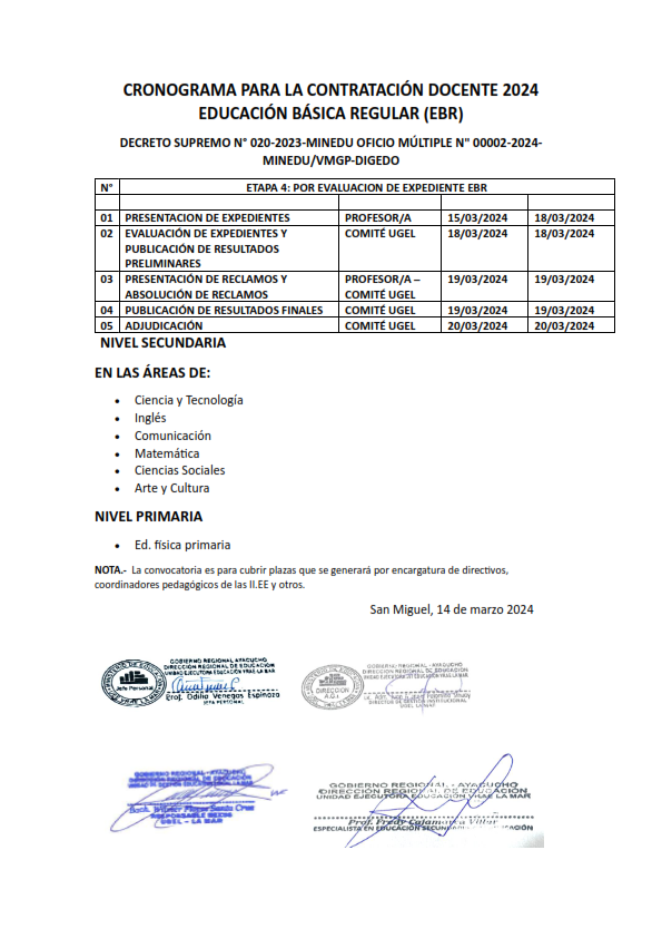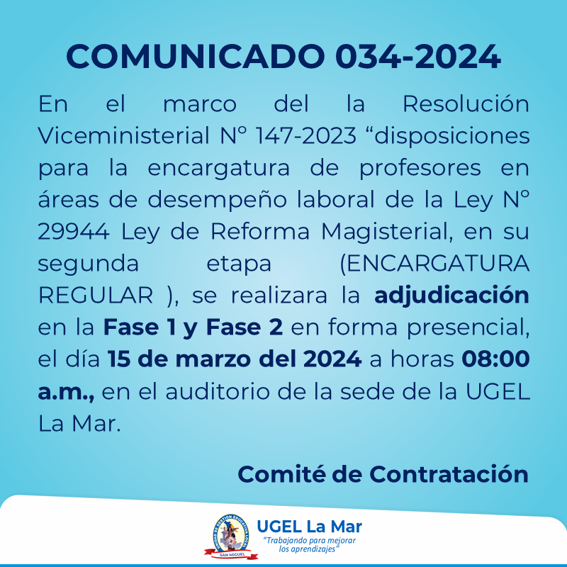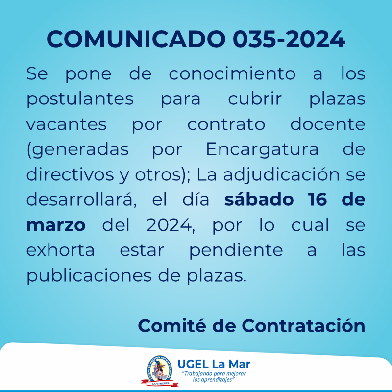 Se adjudicará plazas generadas por Encargaturas de cargos Directivos y otros en el nivel inicial, primaria y E.B.A., el 16 de marzo del 2024, a las 08:30 a.m., en el auditorio de la UGEL La Mar.