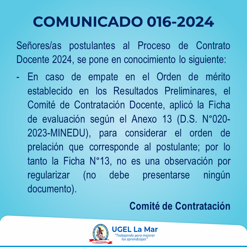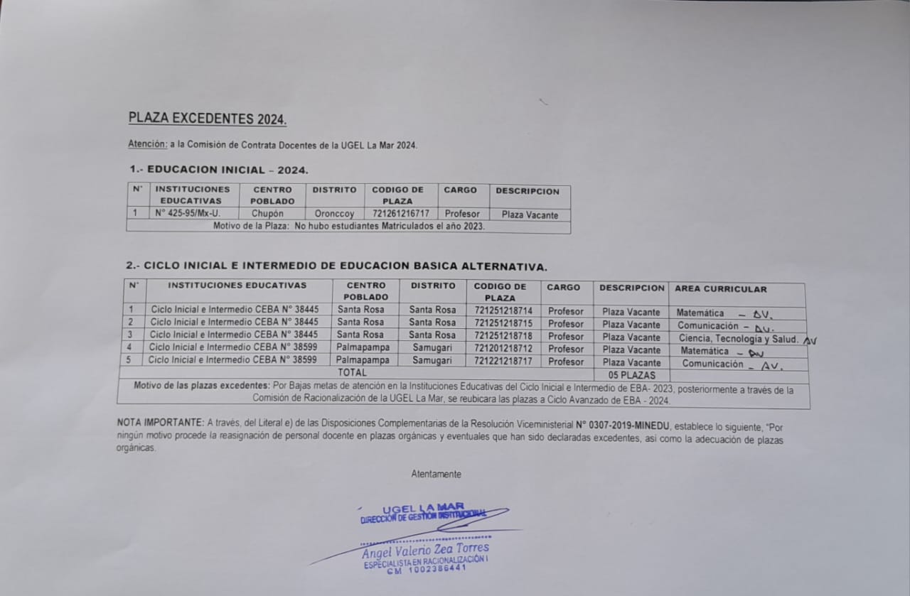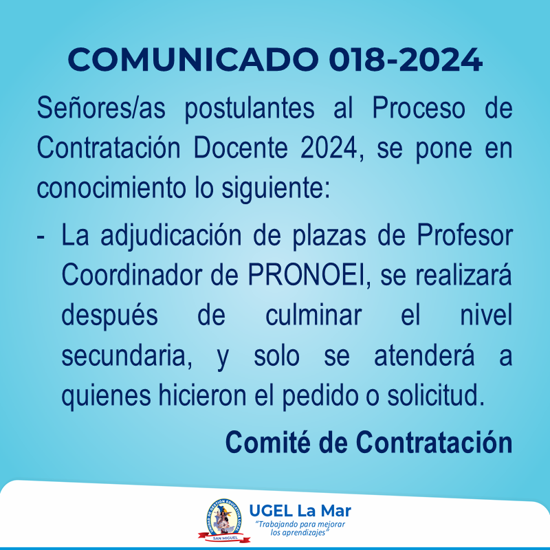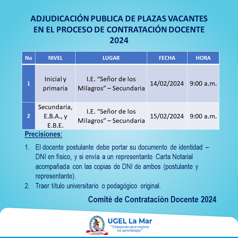 La adjudicación de plazas del Proceso de Contratación Docente 2024, será de acuerdo a las plazas generadas a la fecha respetando ranking PUN, y la misma se realizara el 21 de febrero de 2024 a partir de la 1:00 p.m. en el Auditorio de la UGEL La Mar. Asimismo, indicar que todas las plazas requieres EIB.
