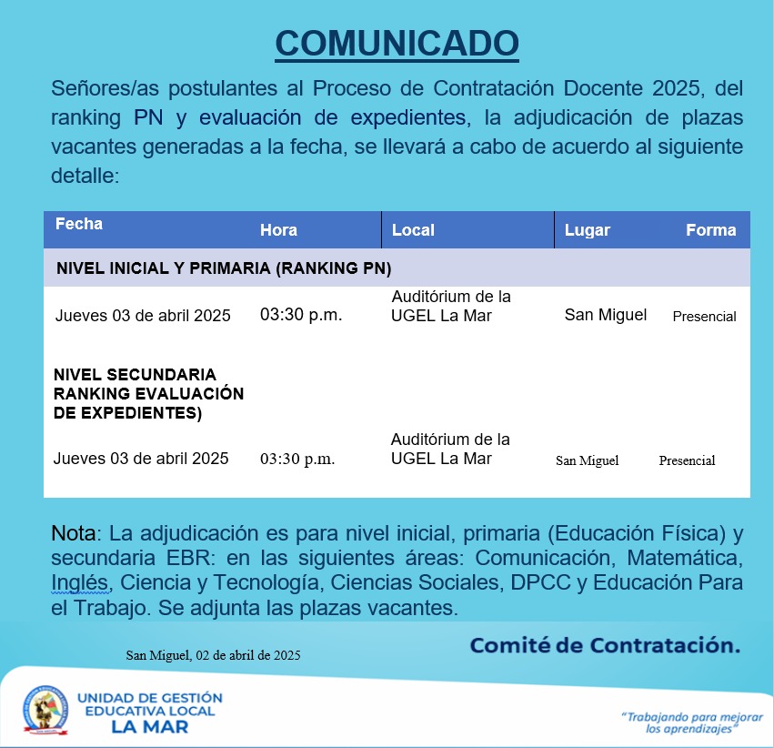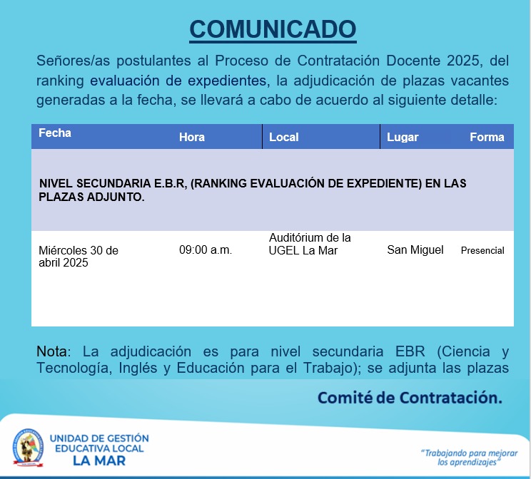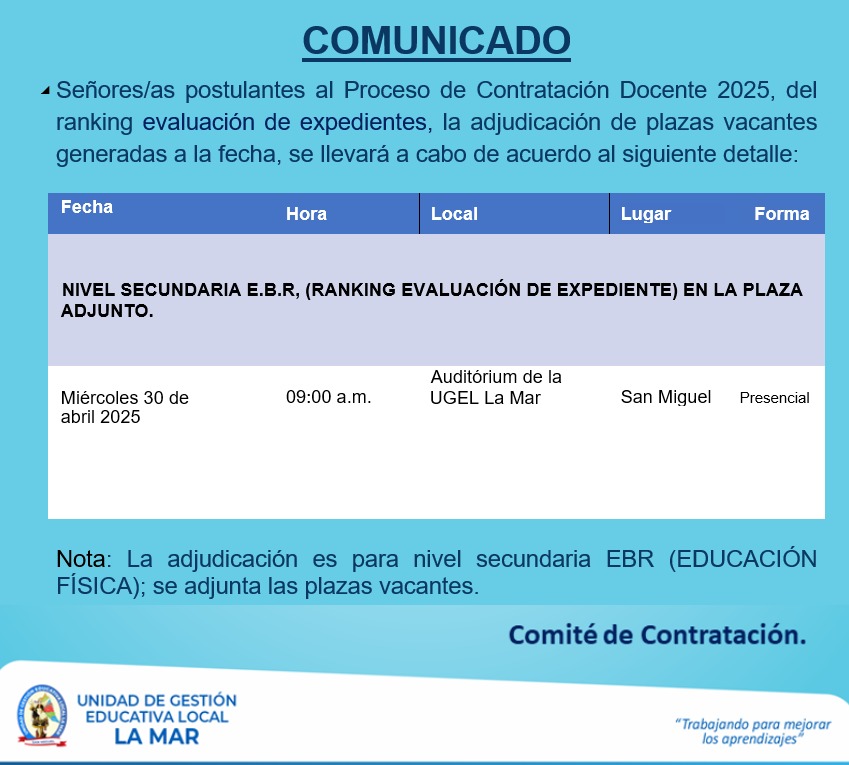 Escrito en 03 Abril 2025. Visto: 1182 Resultado Final de los postulantes III Etapa para la Contratación Docente 2025 - Evaluación de Expedientes Ver detalles: