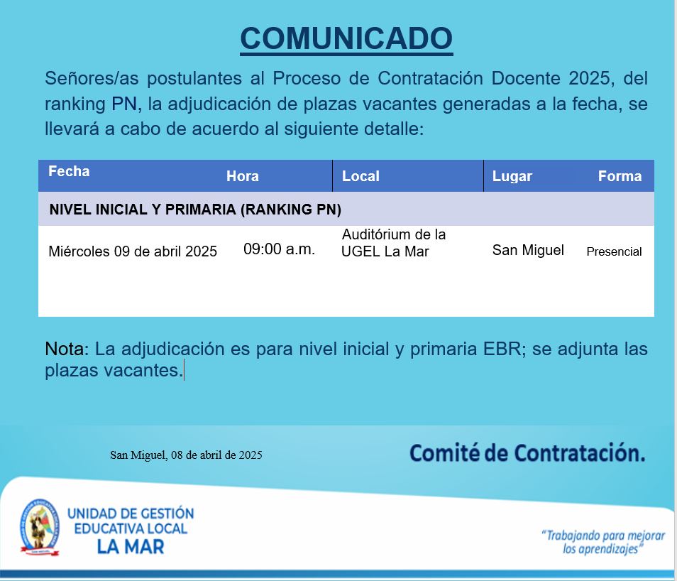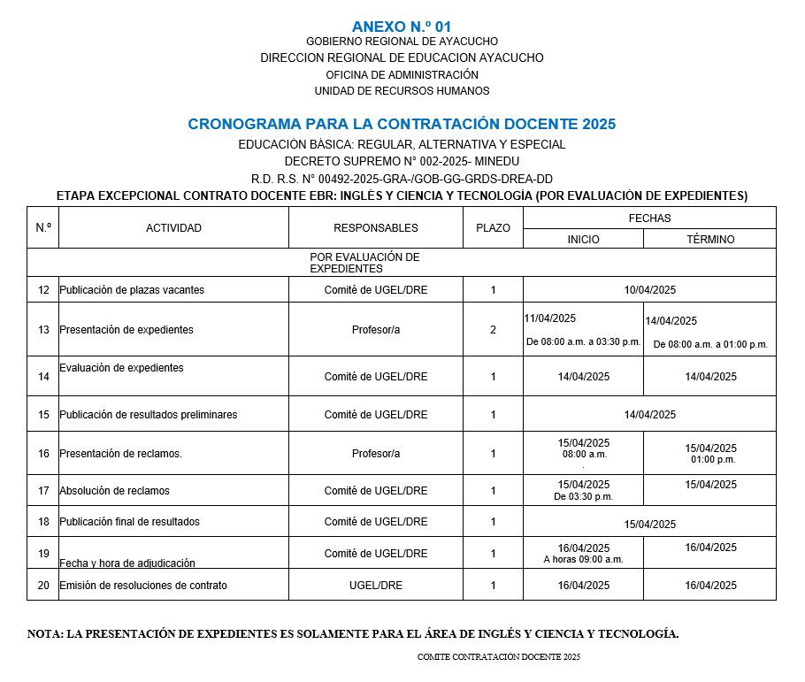 Escrito en 24 Abril 2025. Visto: 1269 Cronograma para Contratación Docente 2025: Evaluación de Expedientes (Área: Comunicación EBA) Ver detalles: